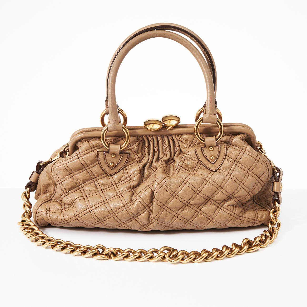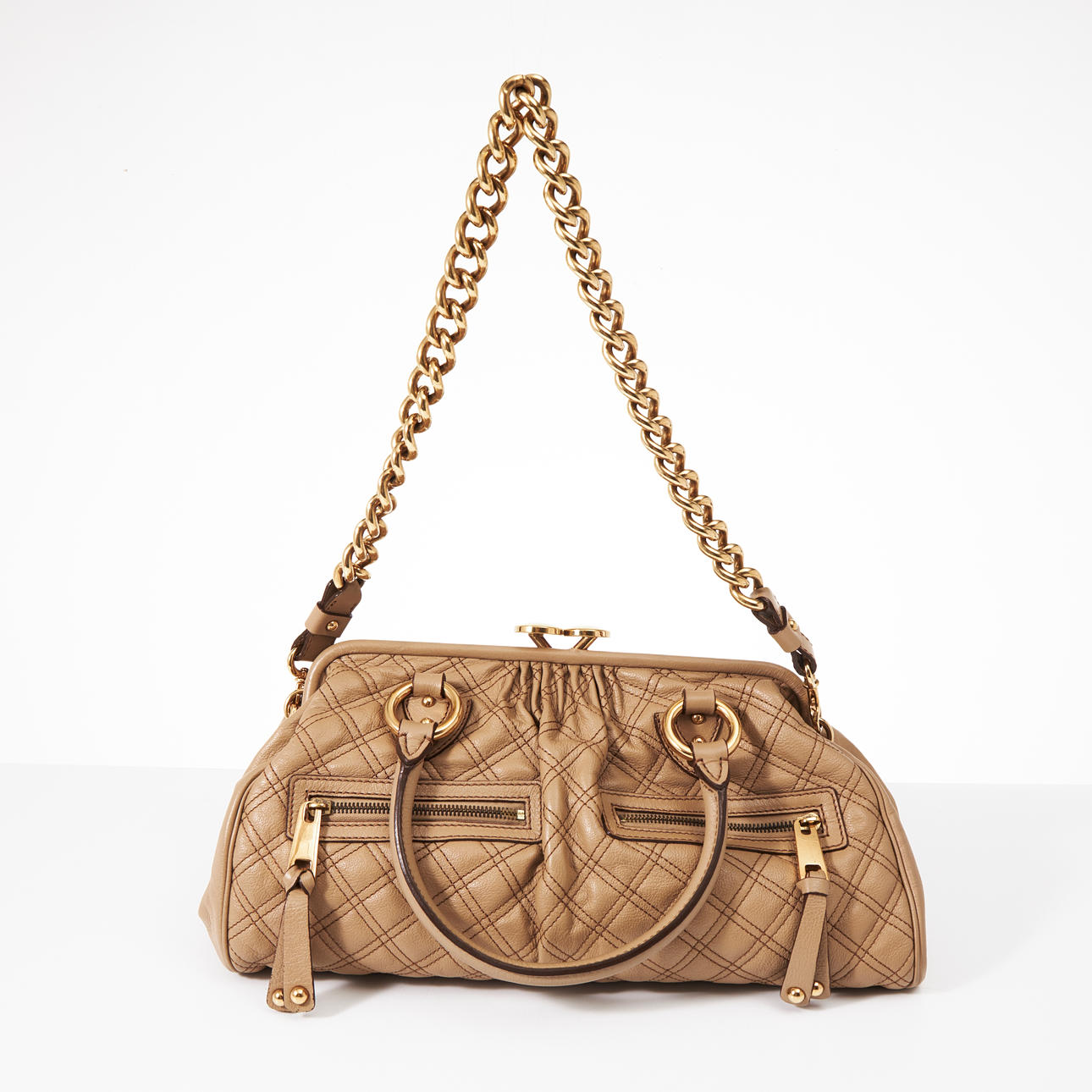 beige quilted lambskin with gold-colored hardware and shoulder chain, oversized clasp marked “MARC JACOBS”, two pockets with zippers at the front, inside a zippered compartment and lined with light beige fabric, marked “MARC JACOBS MADE IN ITALY”, approx. 38 cm x 20 cm x 12 cm.