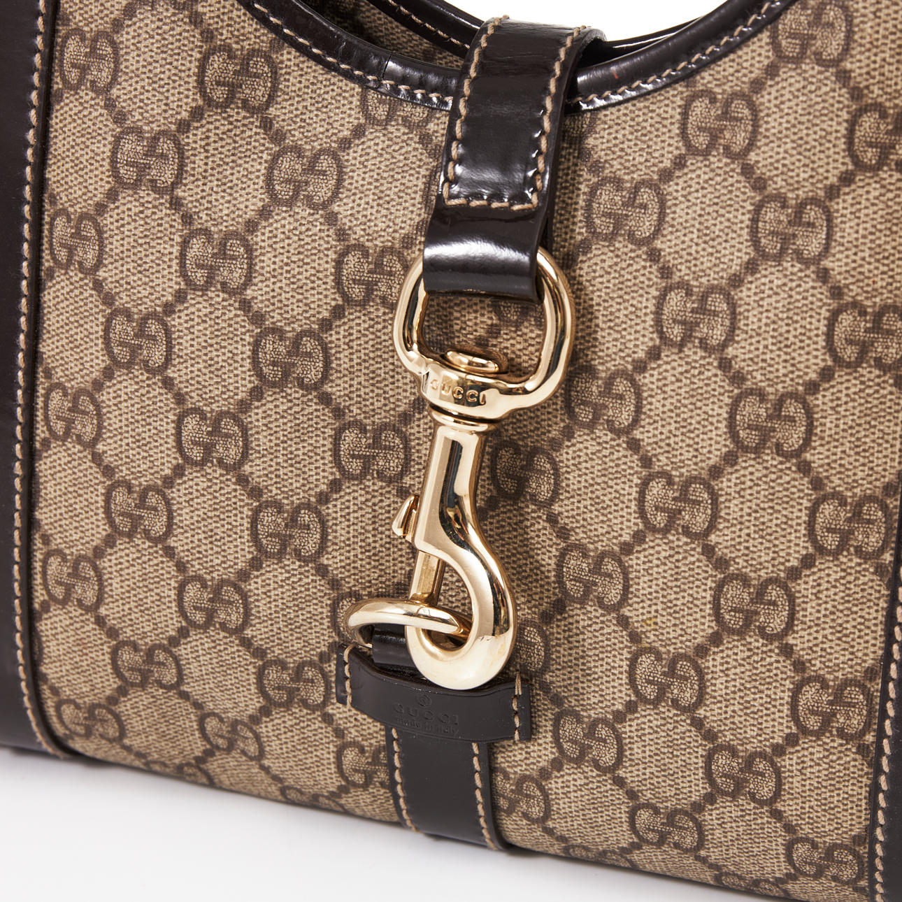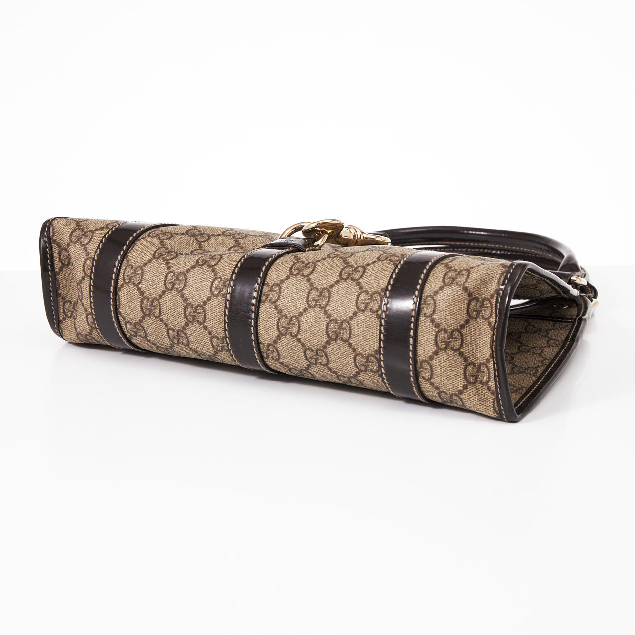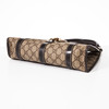 monogram canvas with dark brown lacquered leather details and gold-colored hardware, inside a small compartment and lined with brown canvas, marked “GUCCI made in italy”, 29 cm x 24 cm x 8 cm.
