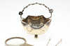 The magnifier with some minor bending and dents, handle missing, plated sugar basket with loss of plating and tongs reasonable.