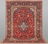 Main field in red with central medallion and corner ornaments. Decor of arabesques and palmettes. Main border in blue with palmettes.