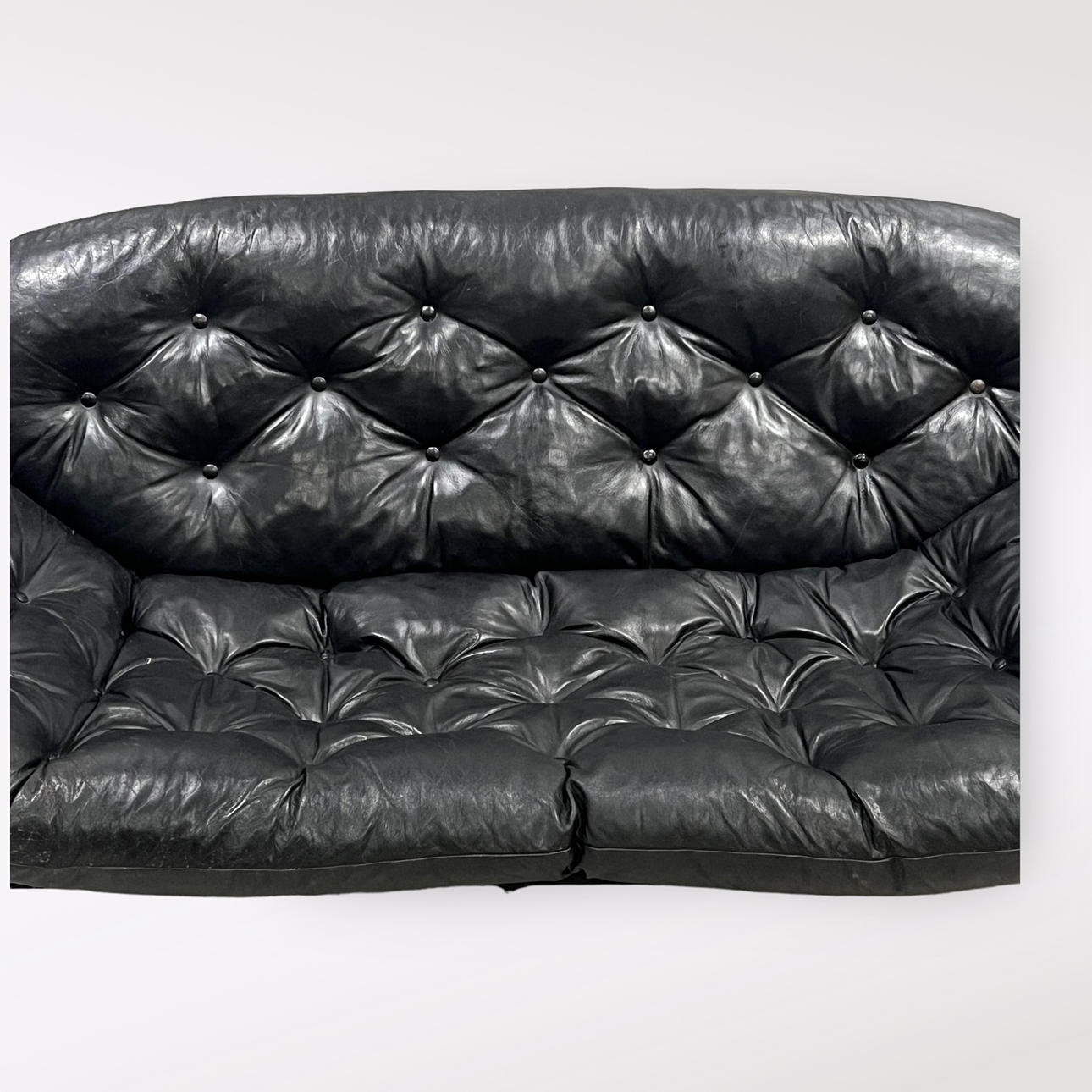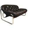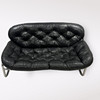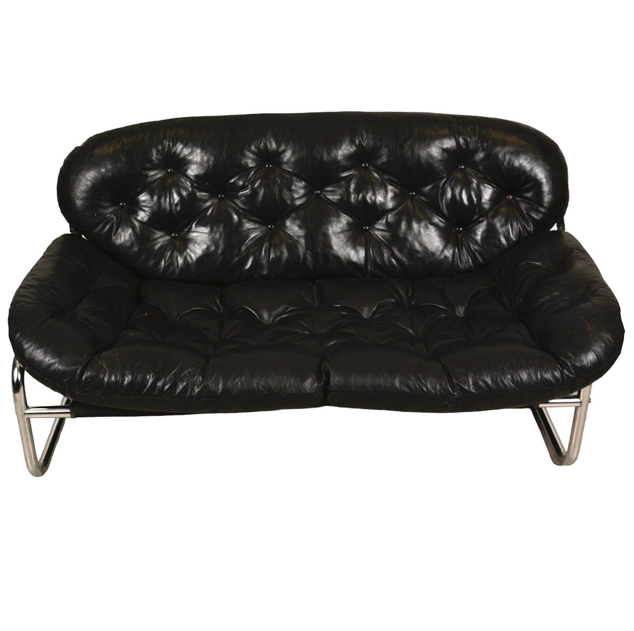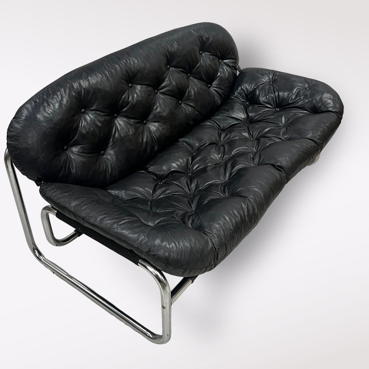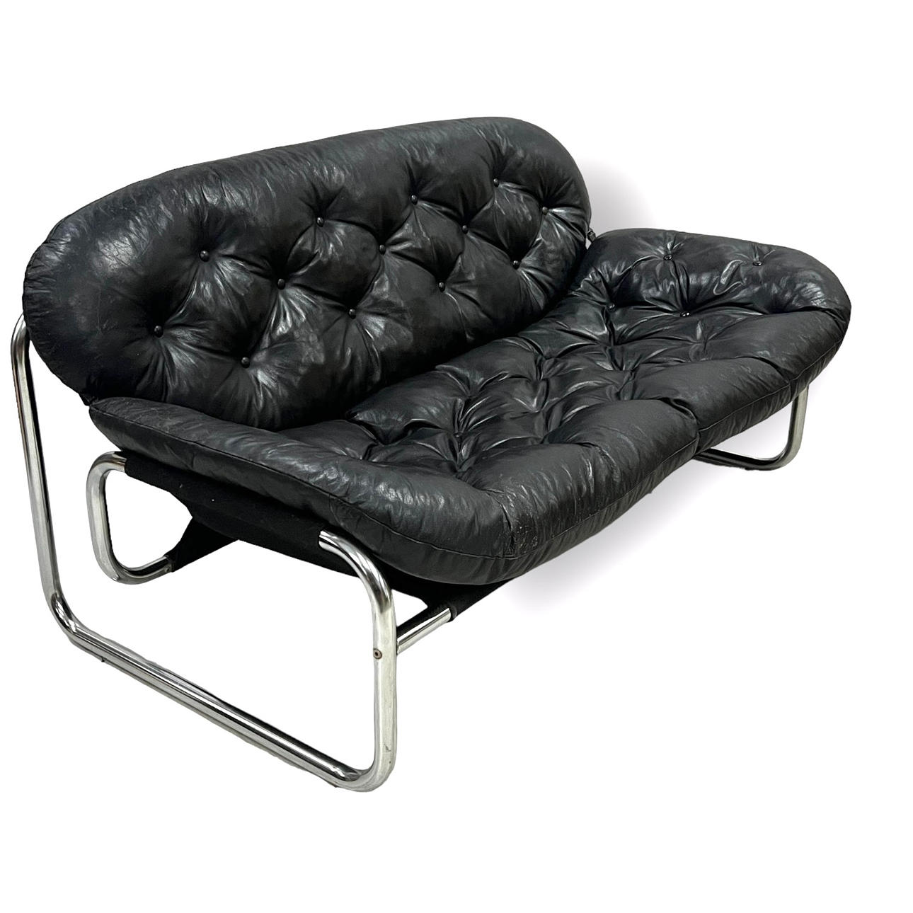 Two-seater sofa with steel tube frame. Canvas bottom and 2 seat cushions upholstered in black leather. Width 157 cm