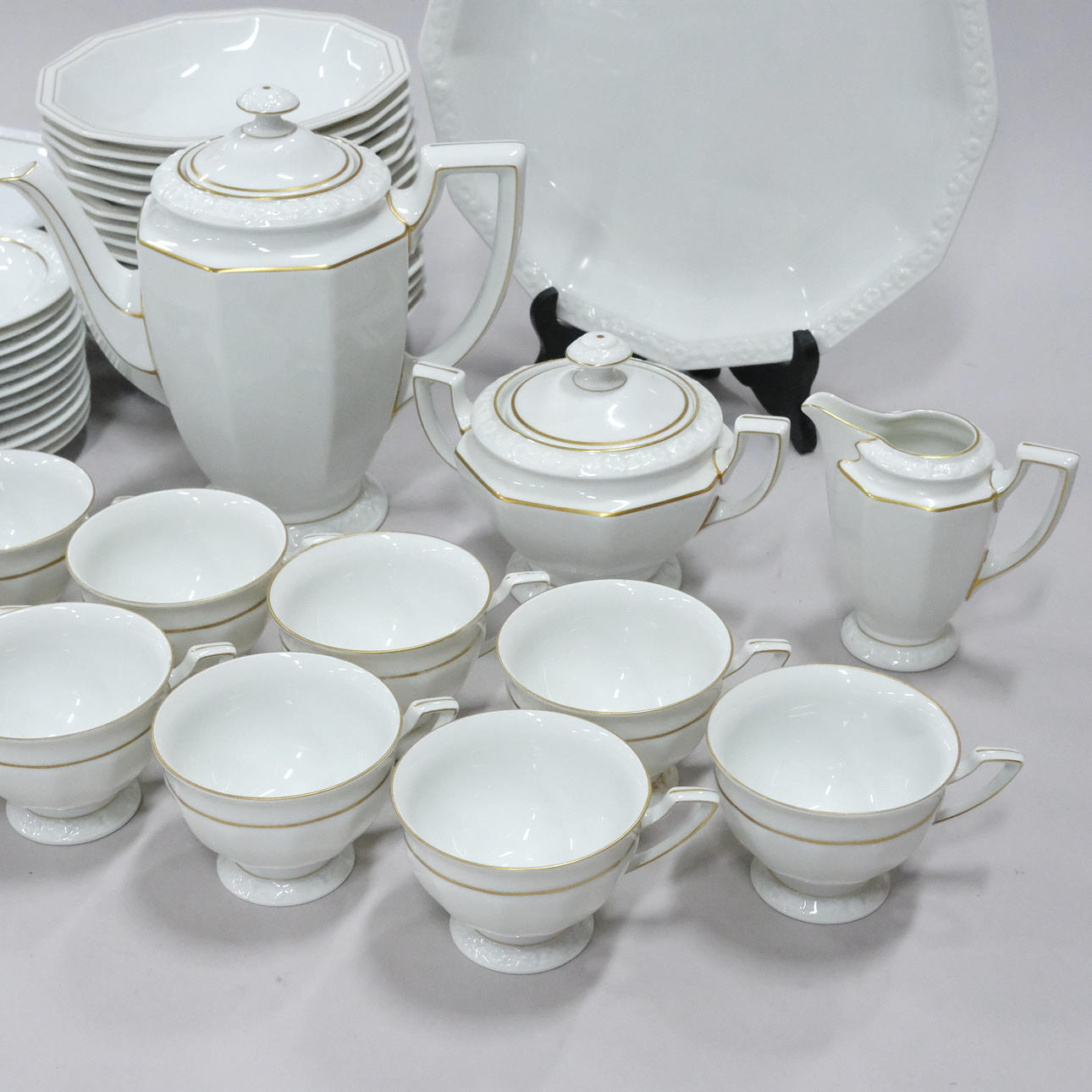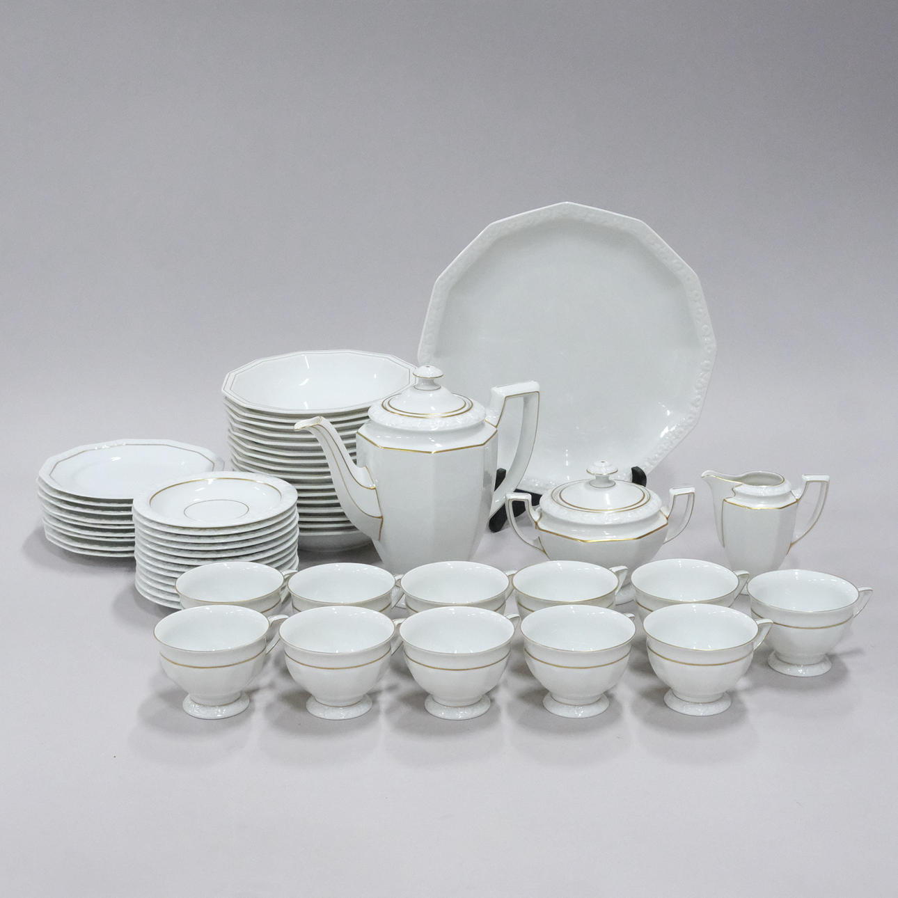 Gilt decoration, 11 cups, height 6,5cm, 12 saucers, diameter, 14cm, eight siettes, diameter 17cm, sugar bowl, cream jug, coffee pot, saucer without gilding, diameter 28cm.