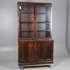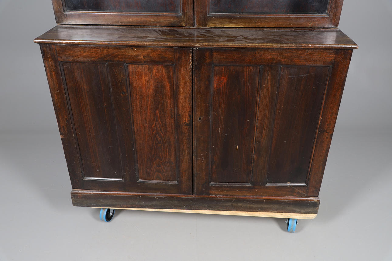 The glazed double door top section (lockable with key), with three interior shelves, sat atop a panelled double door cupboard base with single interior shelf. (No Lock). Height 215cm x Width 125cm x Depth 48cm.