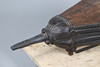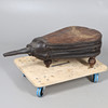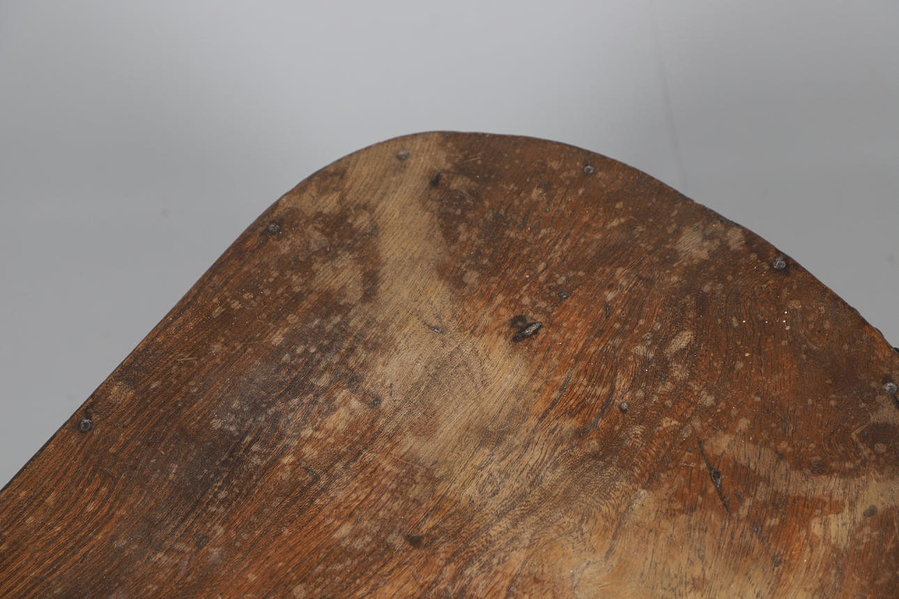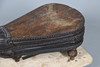 With later added turned legs. Wood, leather and metal construction. Height 29cm x Length 98cm x Depth 52cm.