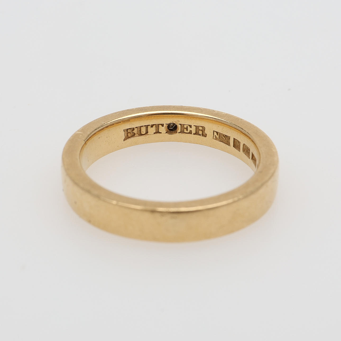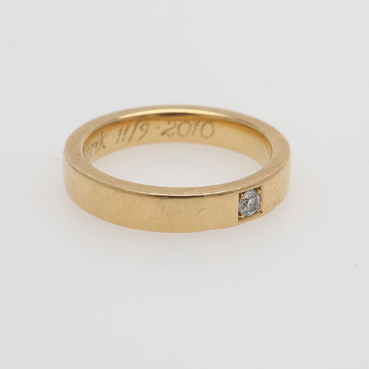 A brilliant cut diamond of approx. 0,03 ct and three smaller ones in 18k gold, stamped David Butler, Malmö 2010, size 16 1/4, weight 5,6 grams, case.