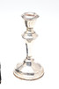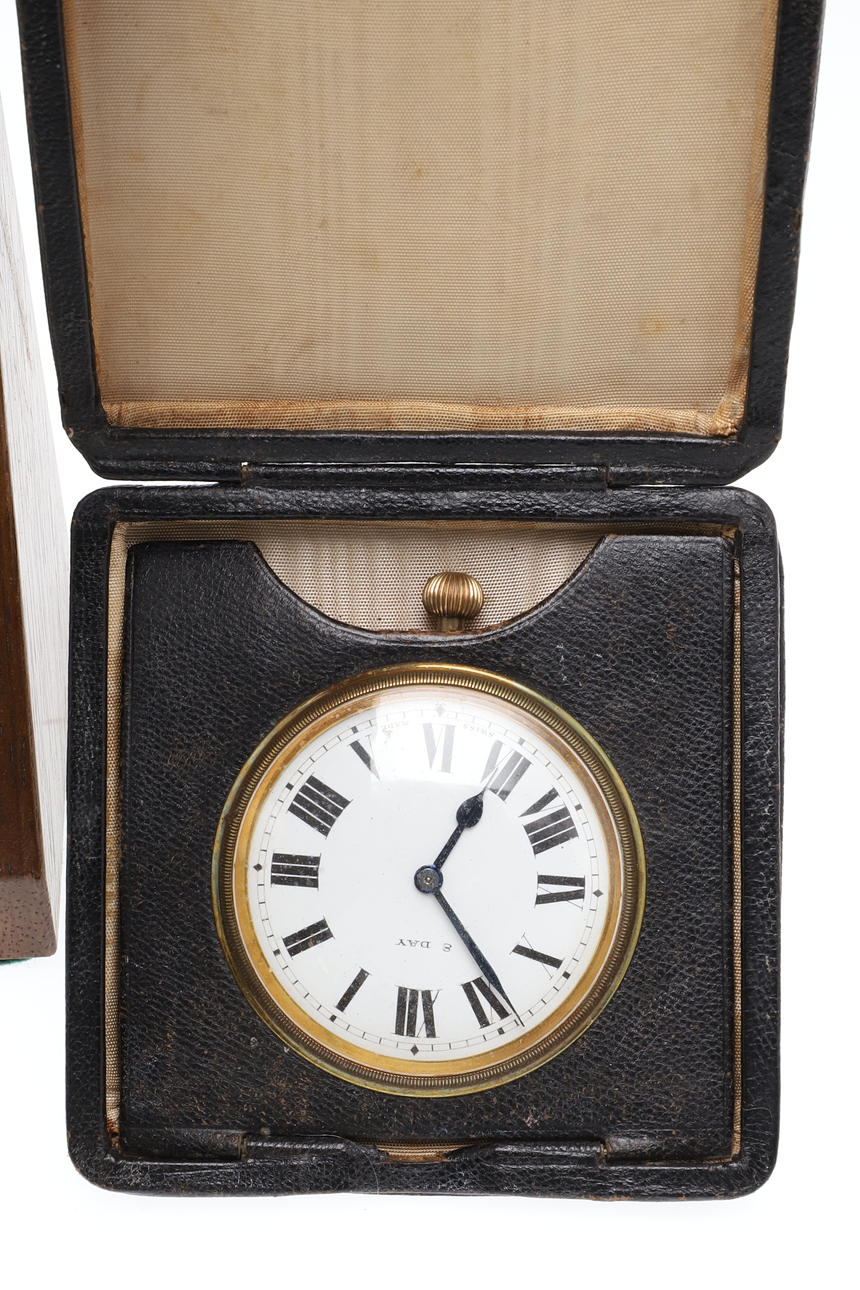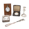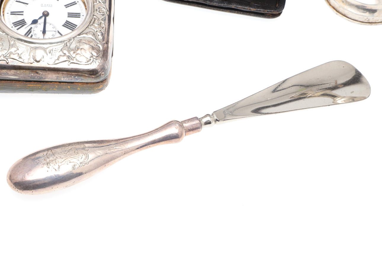 in a metal case, the enamel dial with Roman numerals and contained in a silver mounted case, by Comyns, together with another pocket watch, a travelling clock, a silver candlestick (loaded base), and a silver handled shoe horn (steel blade); the latter 10.75" (27.2cm) long (5).