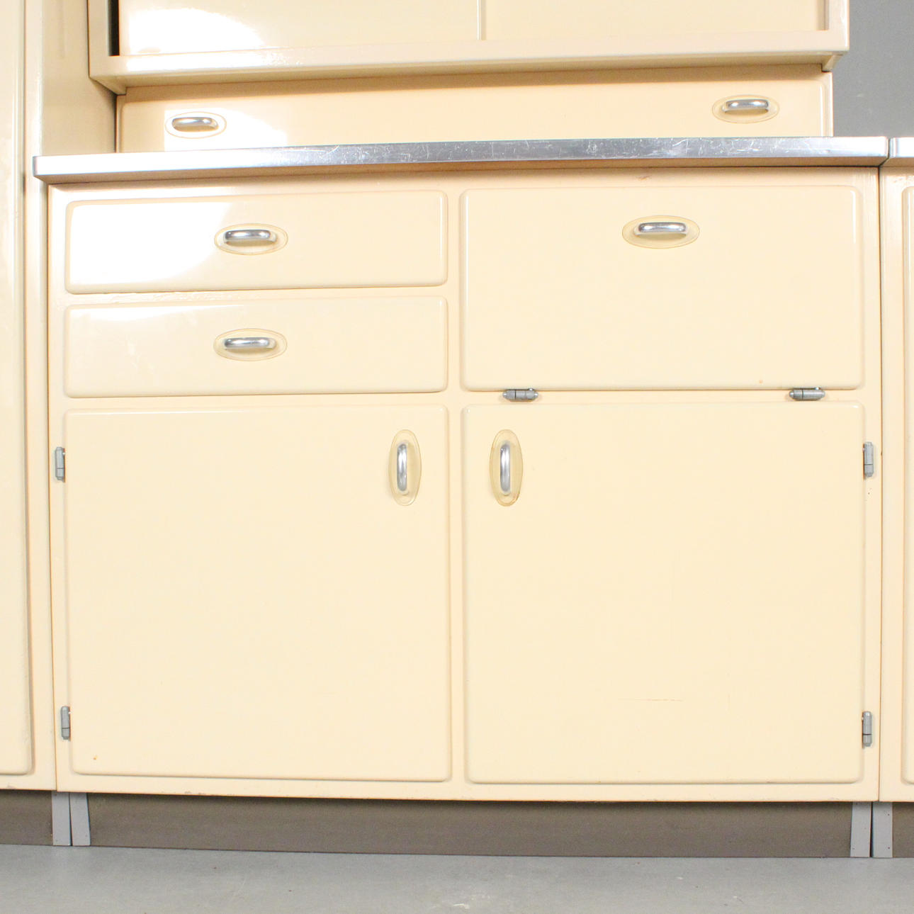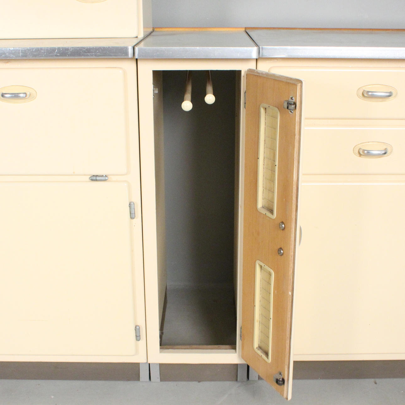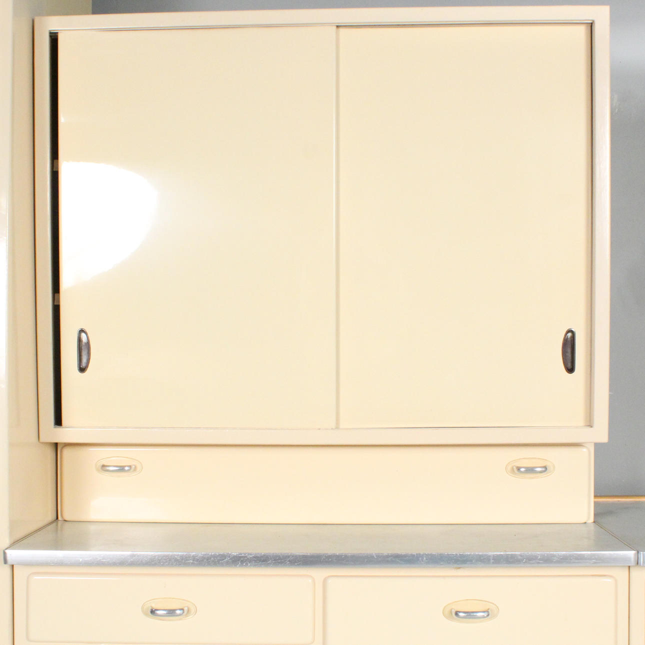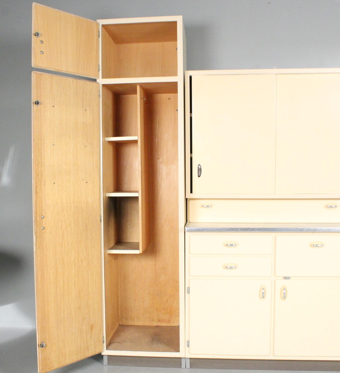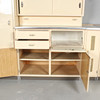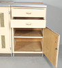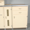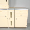 Lanzet, 1950s kitchen unit with light/cream-colored fronts, consisting of four cabinets/base cabinets and a wall cabinet with sliding doors, with manufacturer's label on the back,