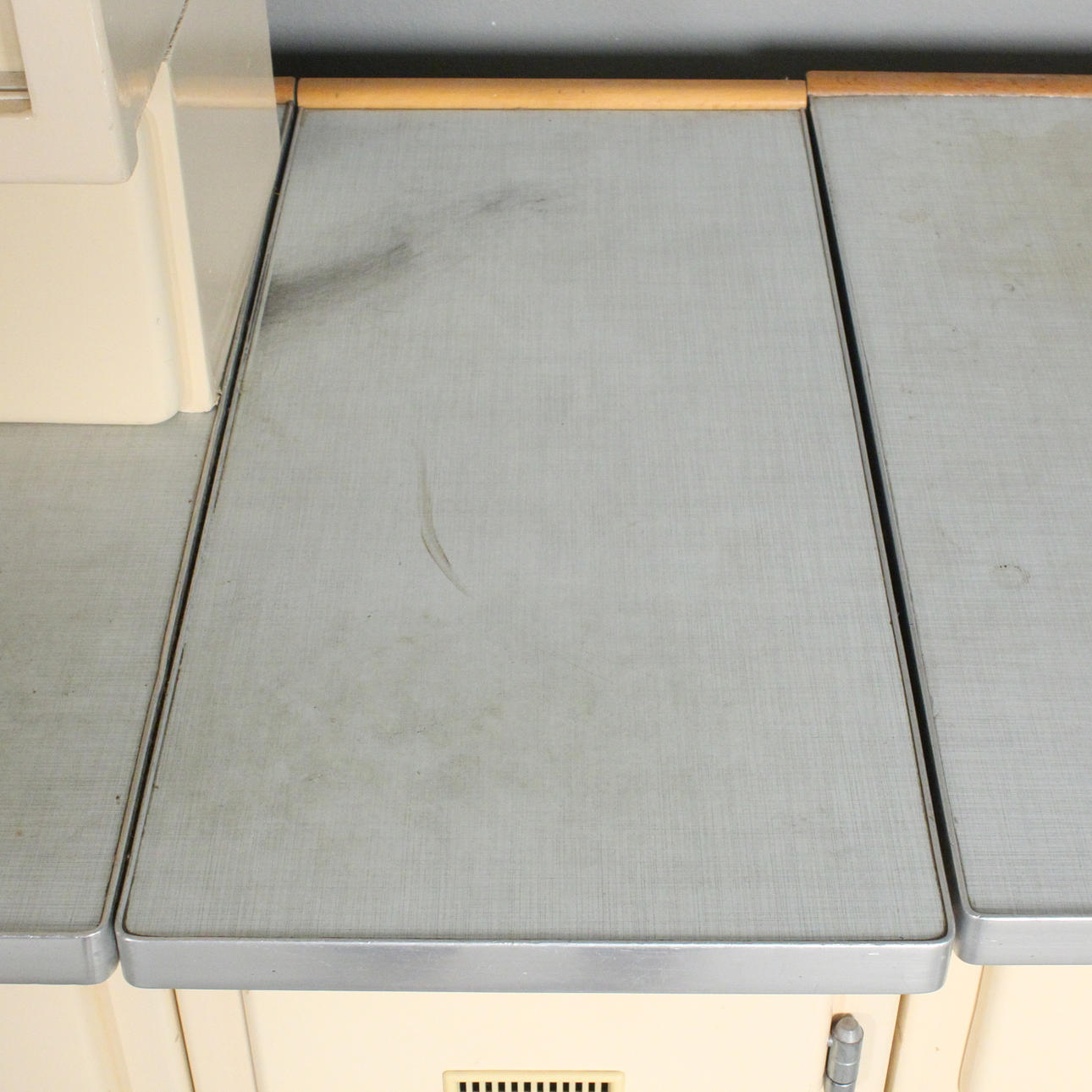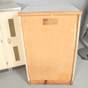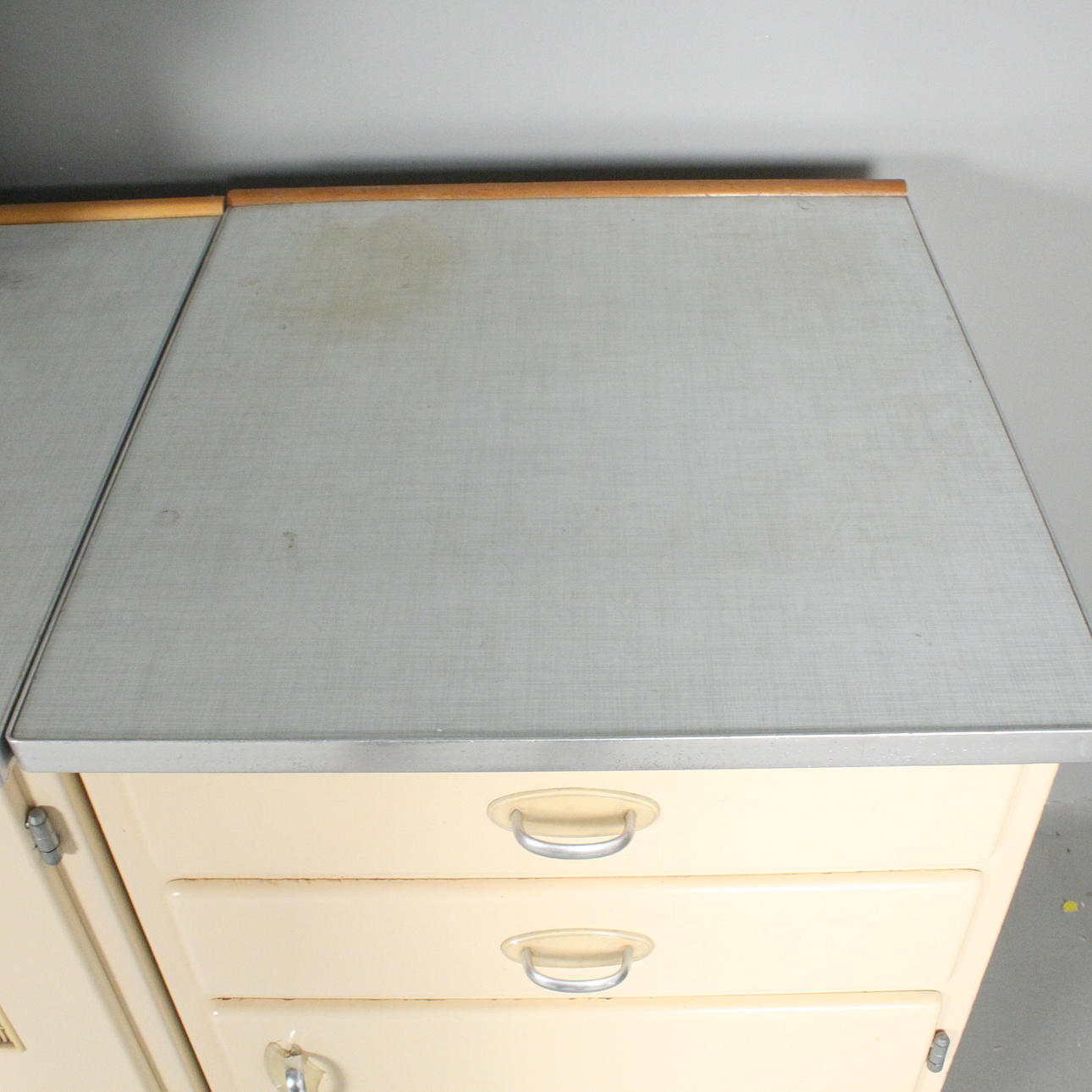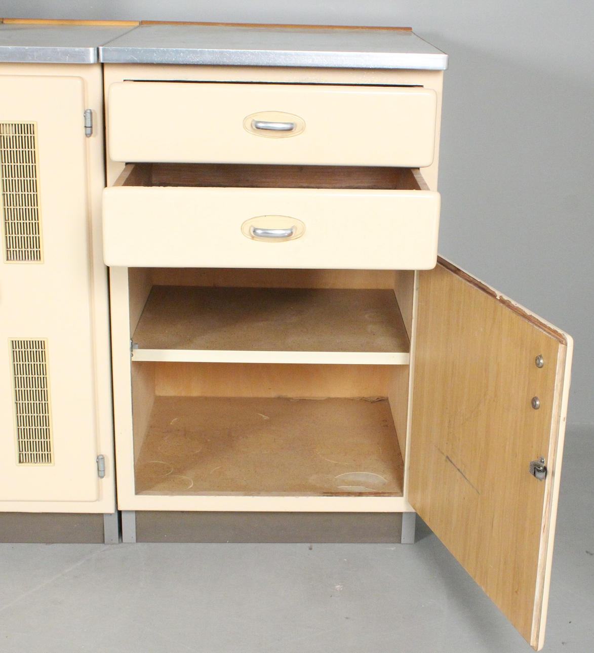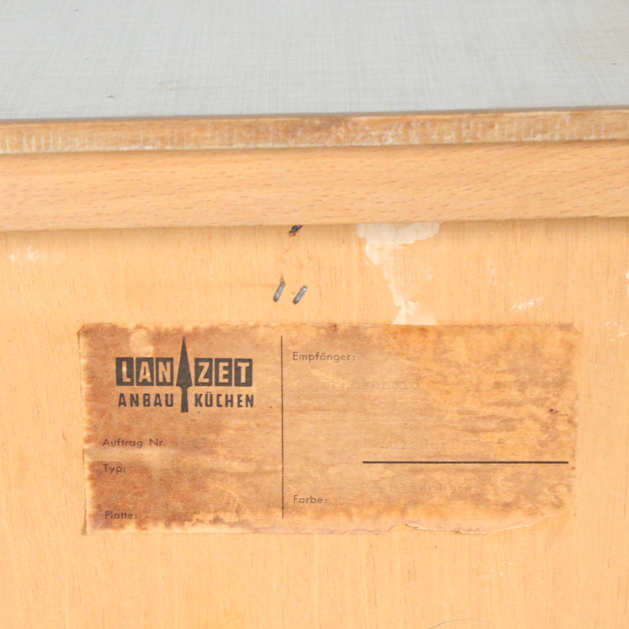 Lanzet, 1950s kitchen unit with light/cream-colored fronts, consisting of four cabinets/base cabinets and a wall cabinet with sliding doors, with manufacturer's label on the back,
