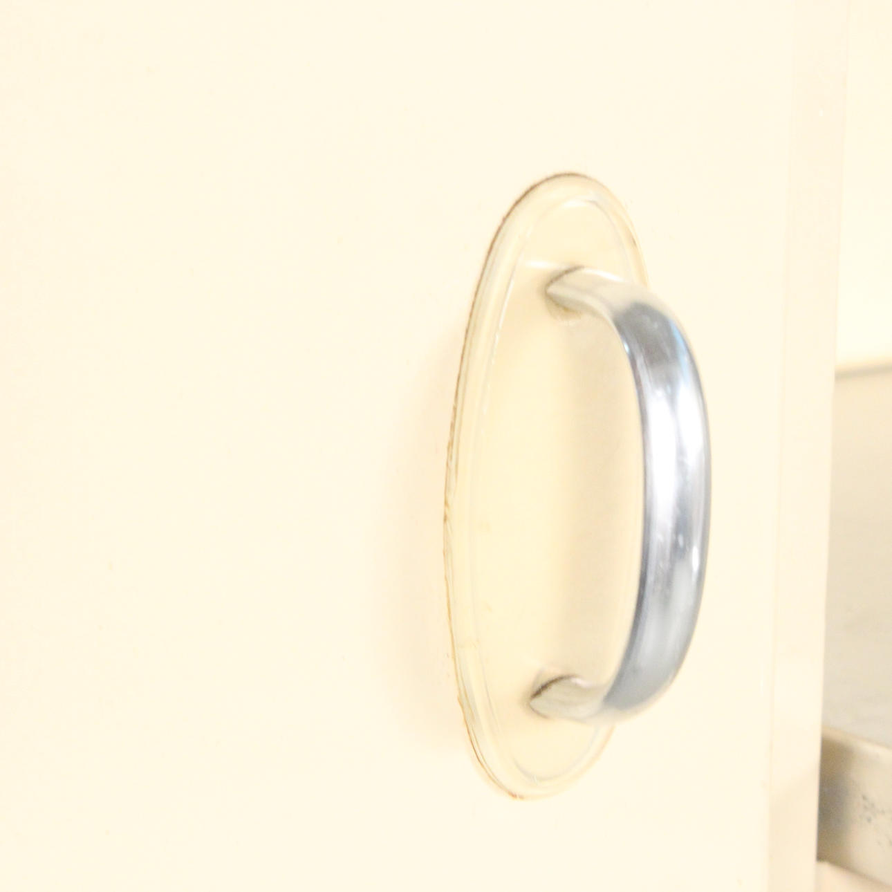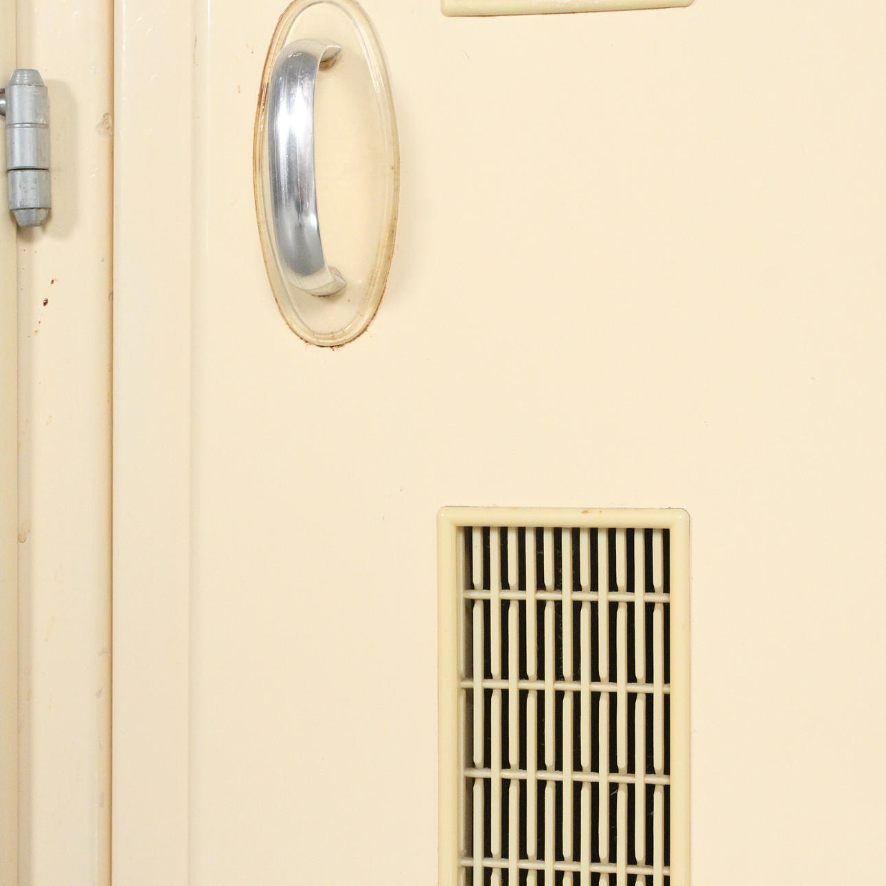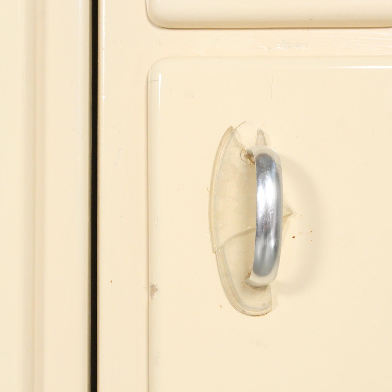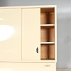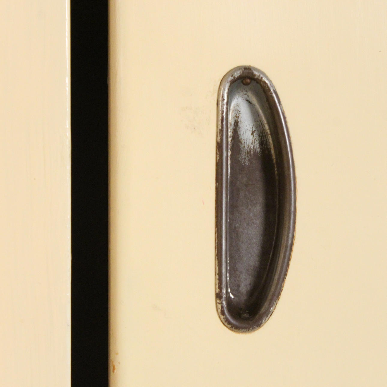 Lanzet, 1950s kitchen unit with light/cream-colored fronts, consisting of four cabinets/base cabinets and a wall cabinet with sliding doors, with manufacturer's label on the back,