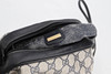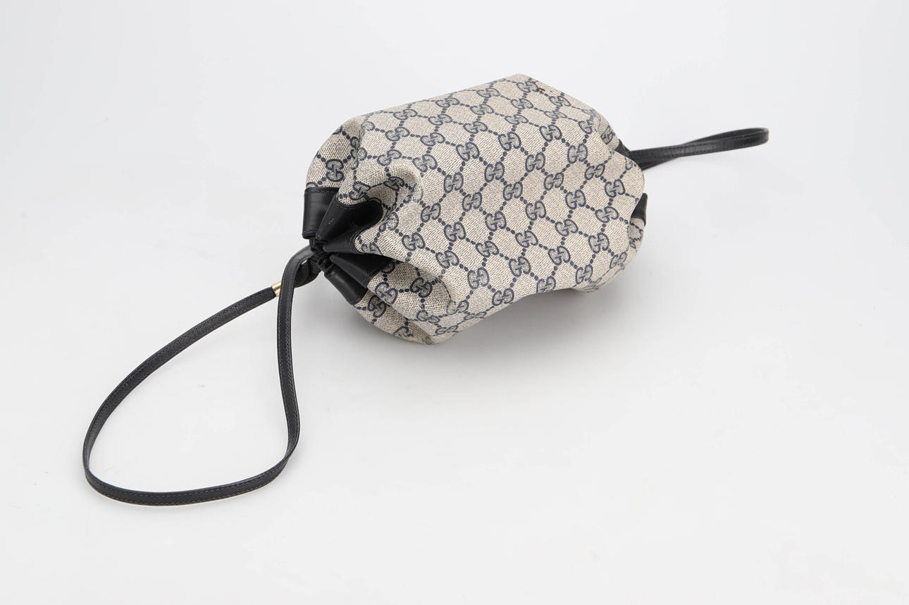 Bag in monogram-patterned canvas, and dark blue pig leather. Inside marked GUCCI, MADE IN ITALY, 007•115•5770. Dimensions approx. 14x20x14cm.