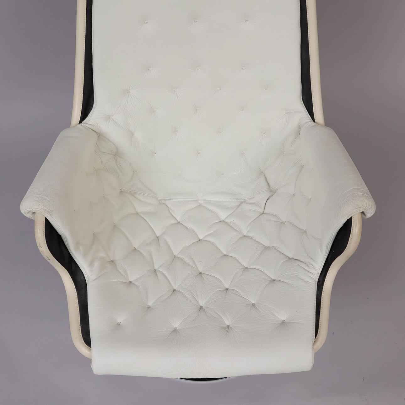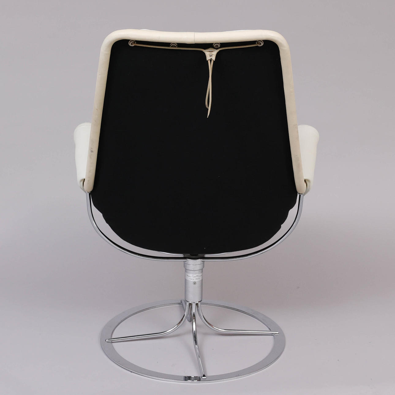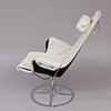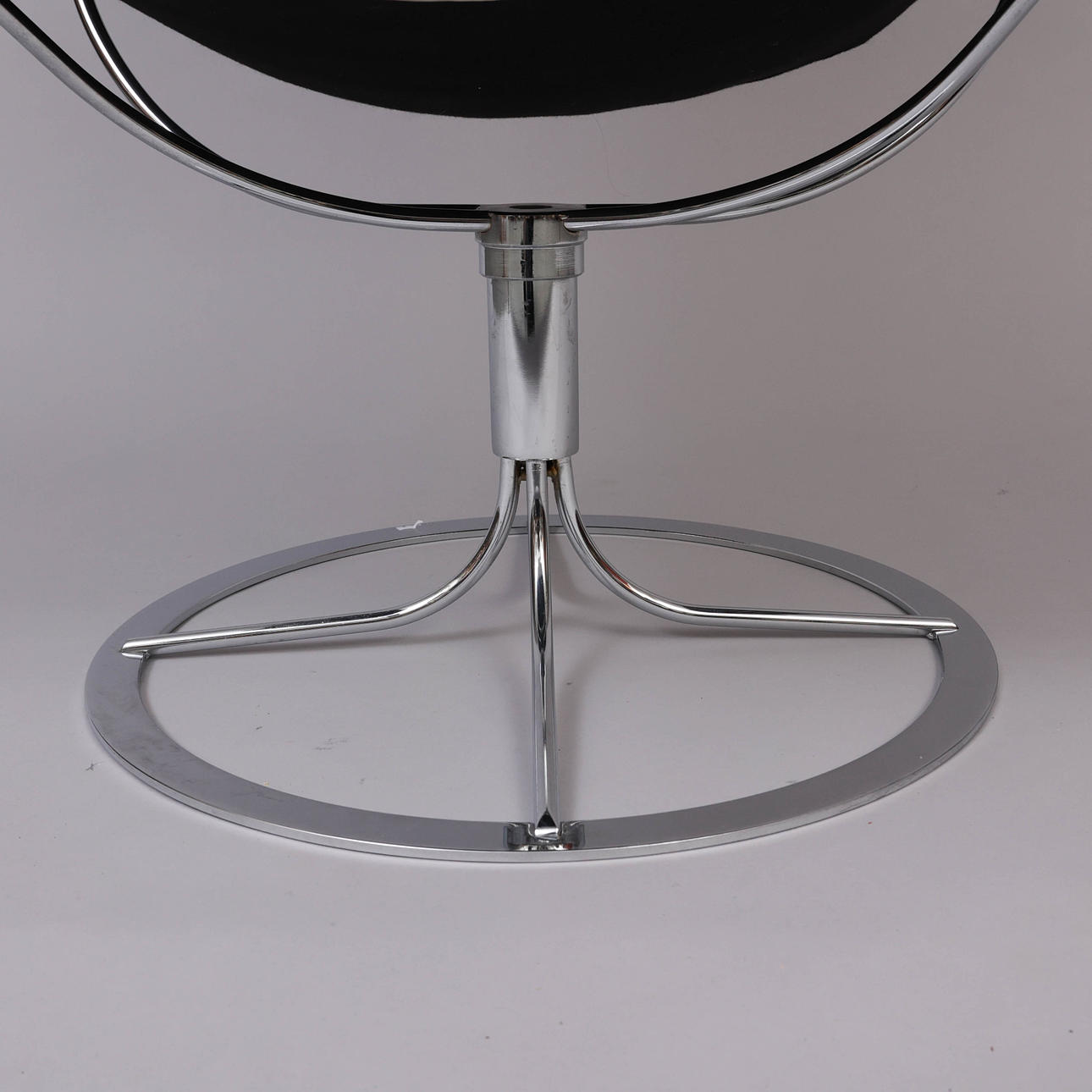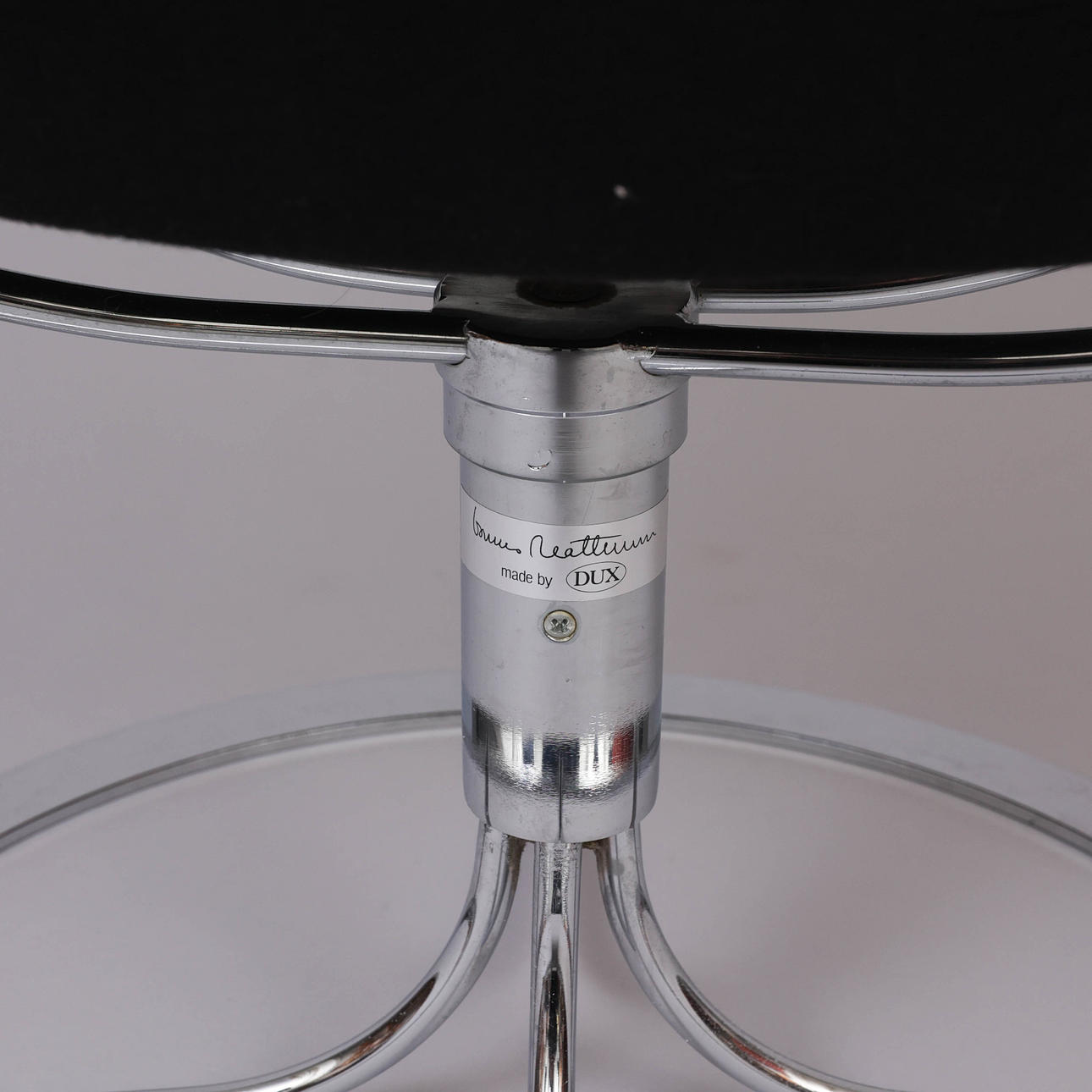 Chrome plated, rotating body, white leather upholstery, equipped with neck cushion. Label marked with signature Seat height 42 cm, total height 98 cm.