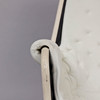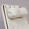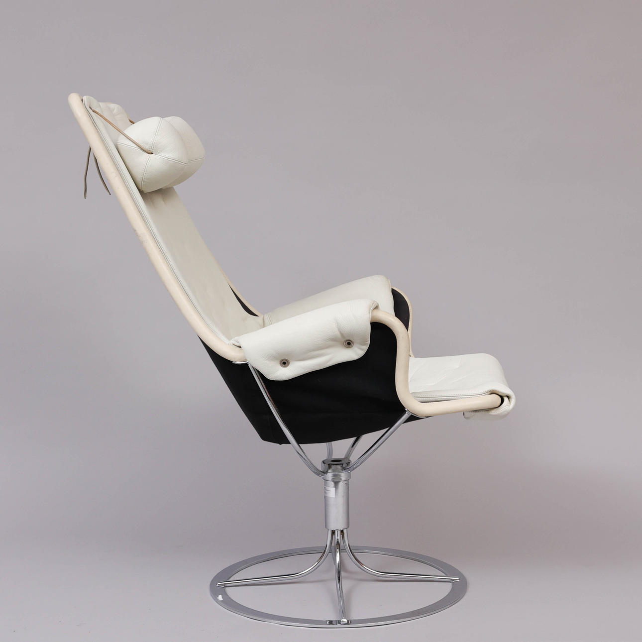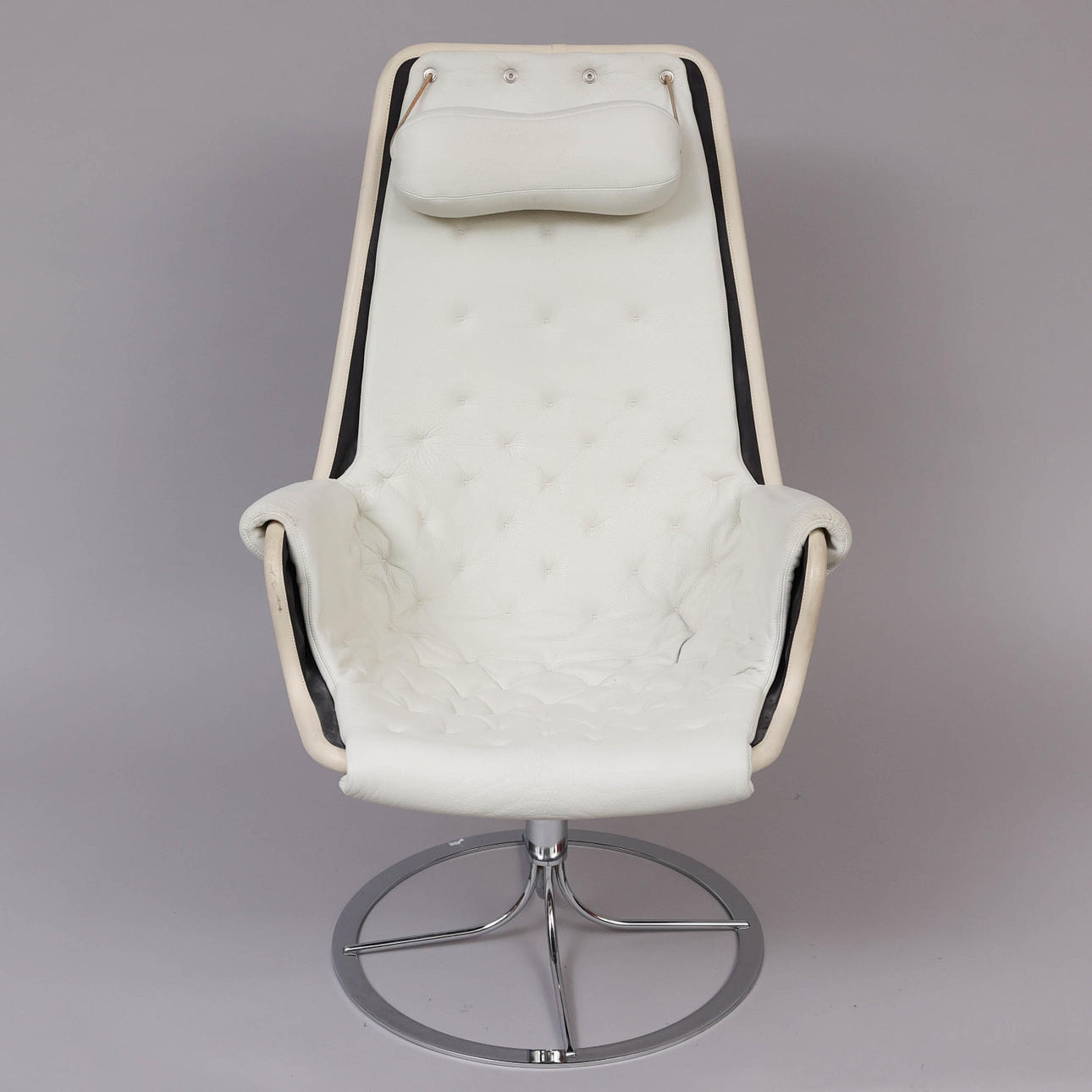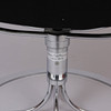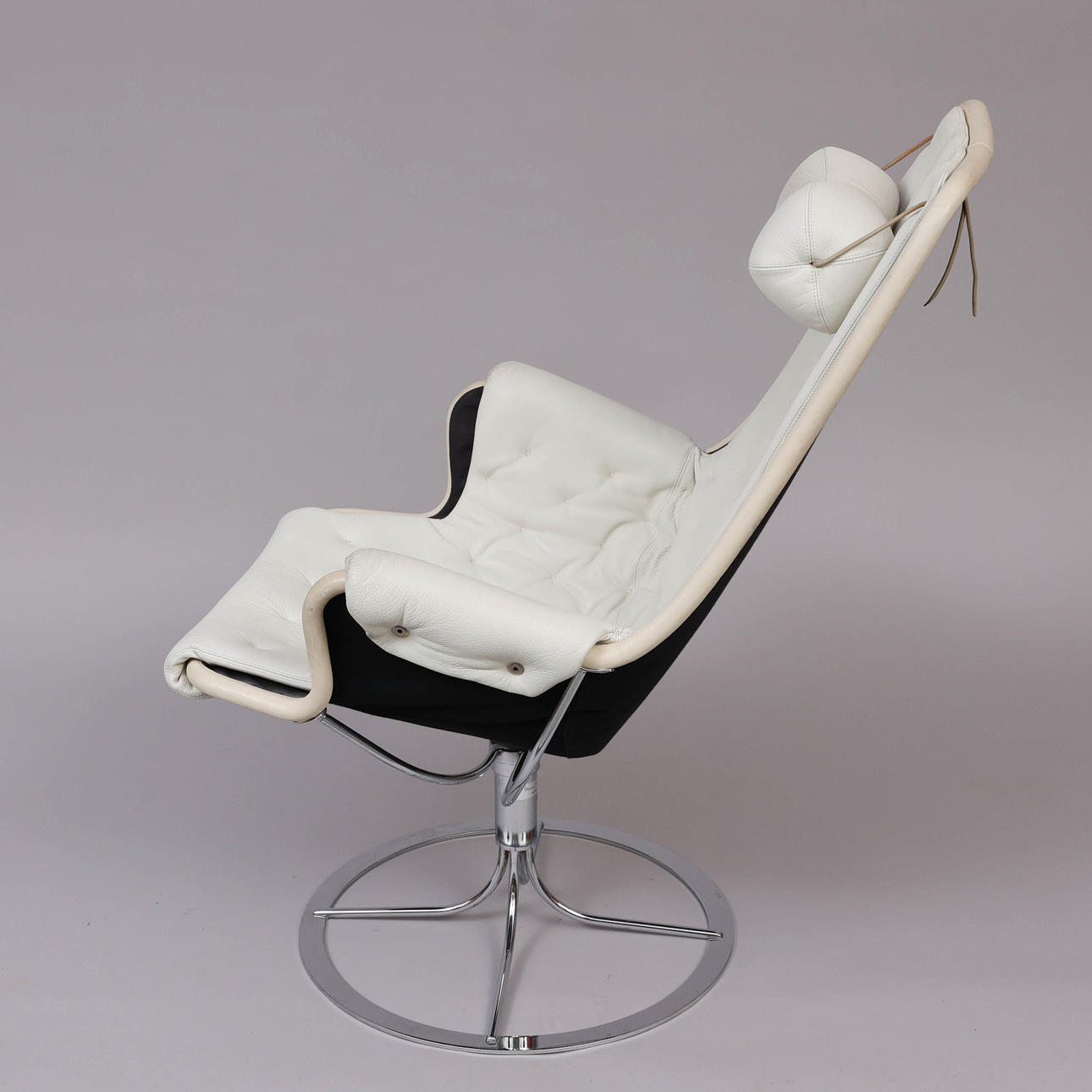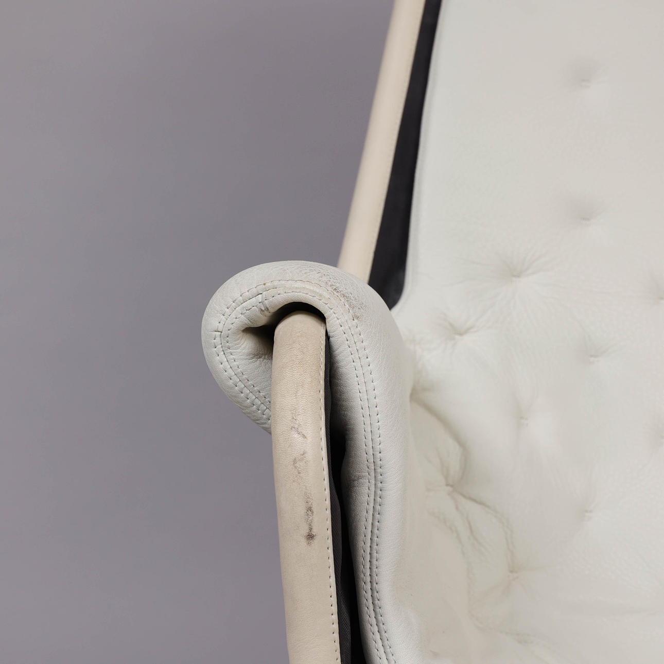 Chrome plated, rotating body, white leather upholstery, equipped with neck cushion. Label marked with signature Seat height 42 cm, total height 98 cm.