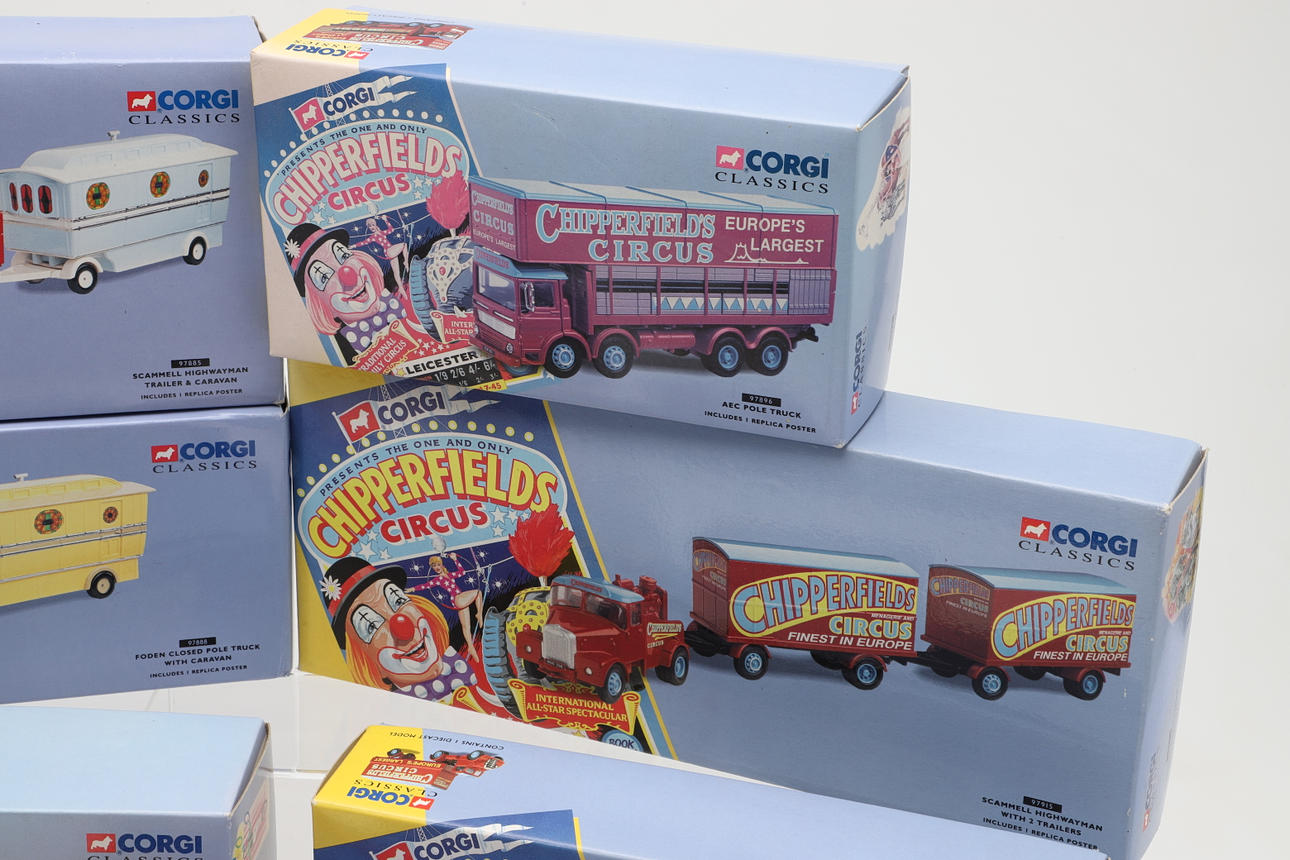 Various boxed Chipperfield Circus models including 97896 Pole Truck, 97888 Foden Pole Truck, 97303 Bedford Truck97885 Scammell Trailer & Caravan, 97915 Scammel Highwayman with two trailers, 97887 Bedford Horse Box, 97889 AEC Cage Truck, 97092 Bedford Pantechnicon, 97022 AEC Regal, 97886 Scammel with Crane, and 96905 Booking Vehicle. (10).
