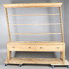 A Pine dresser, with a three tier shelf top and two large drawers to the base, suspended on supports with a lower ground shelf. Height 242cm, width 234cm, depth 45cm.