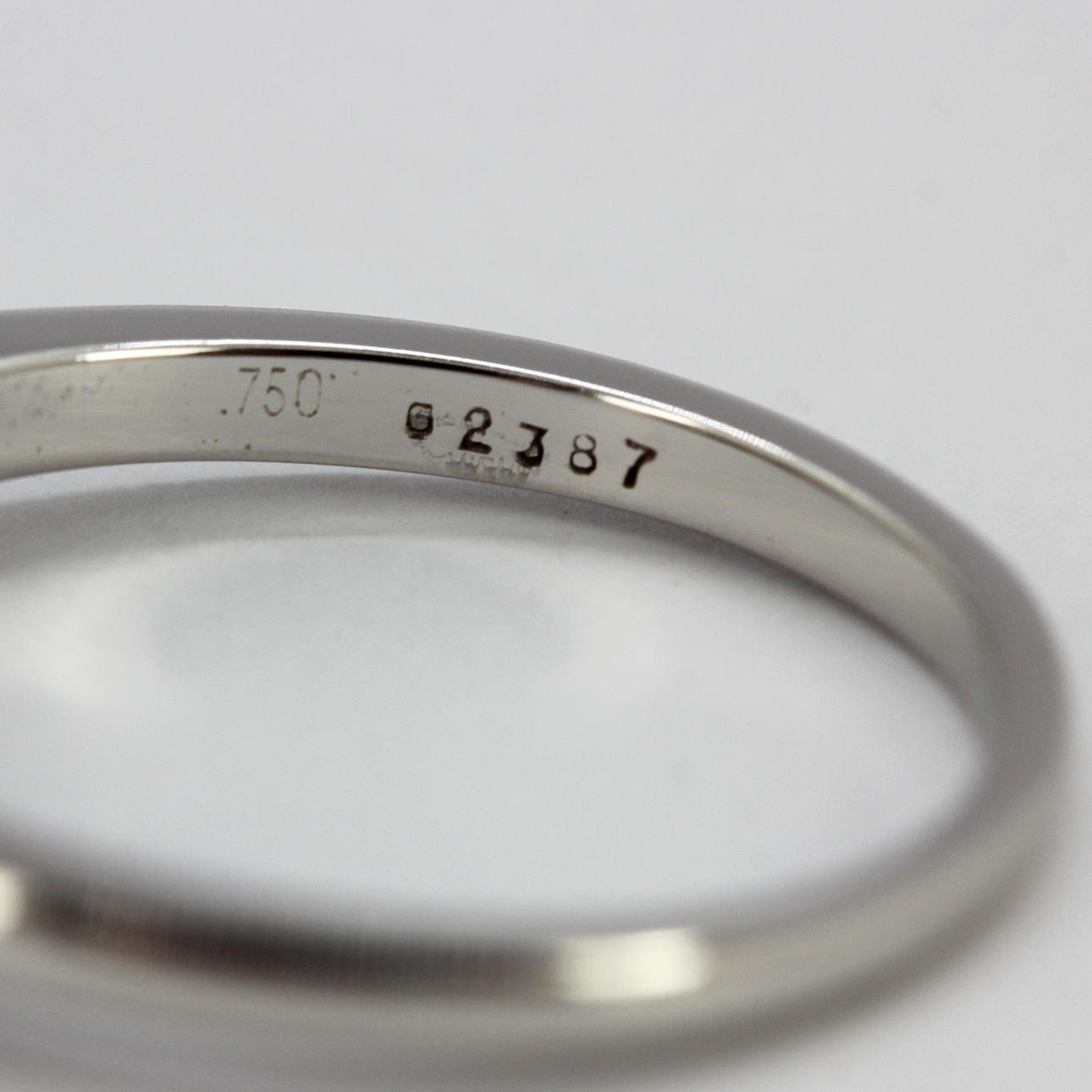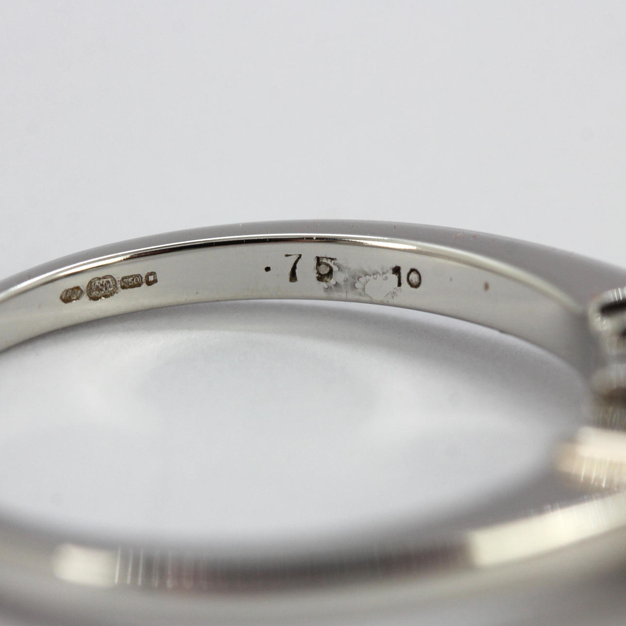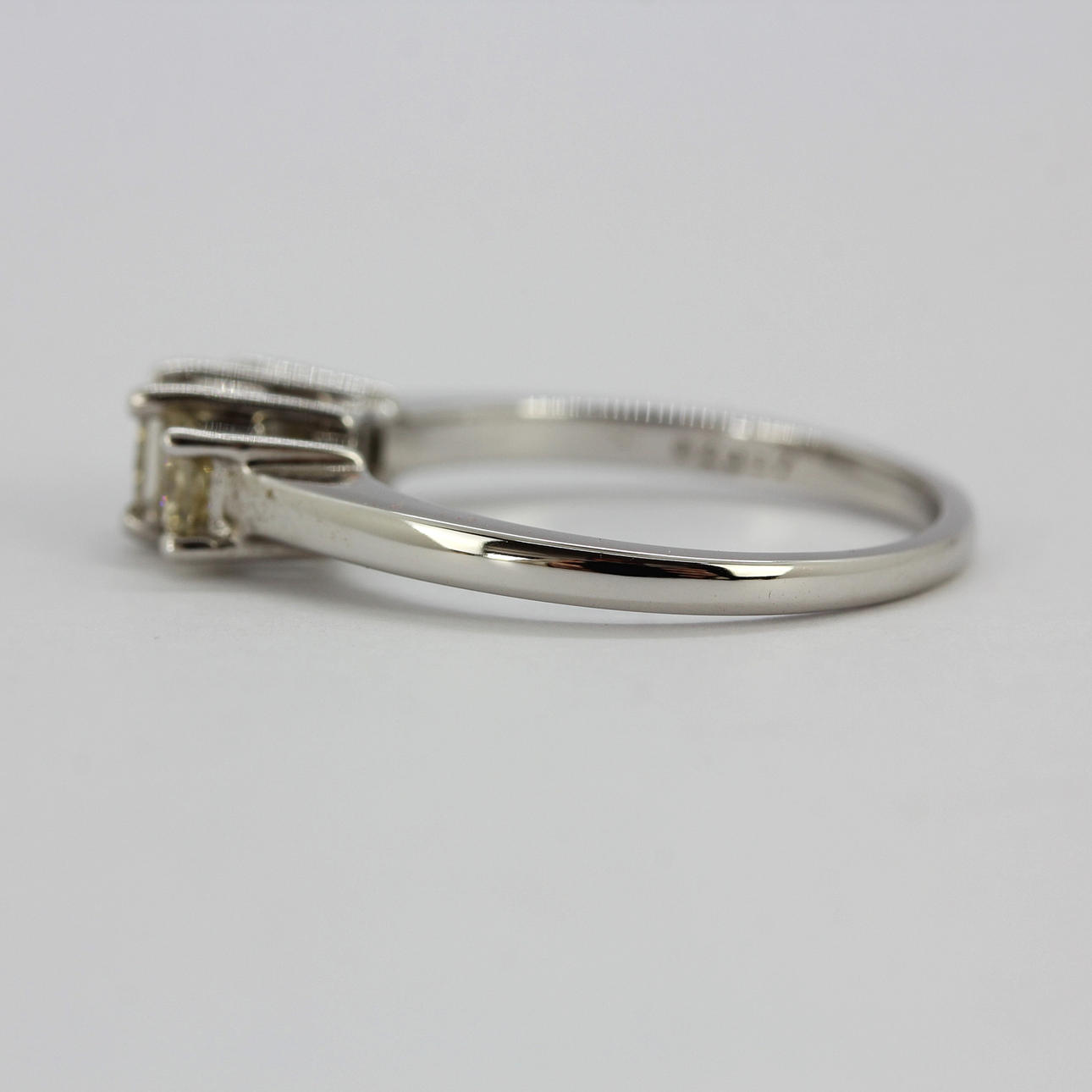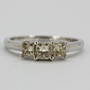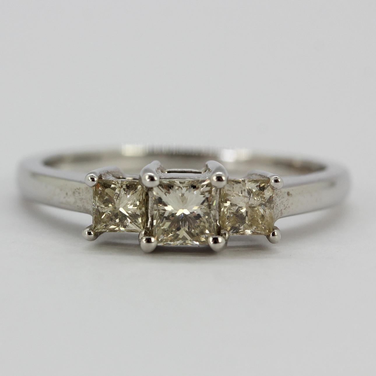 An 18ct white gold three-stone ring set with square cut diamonds, ring size M.5.