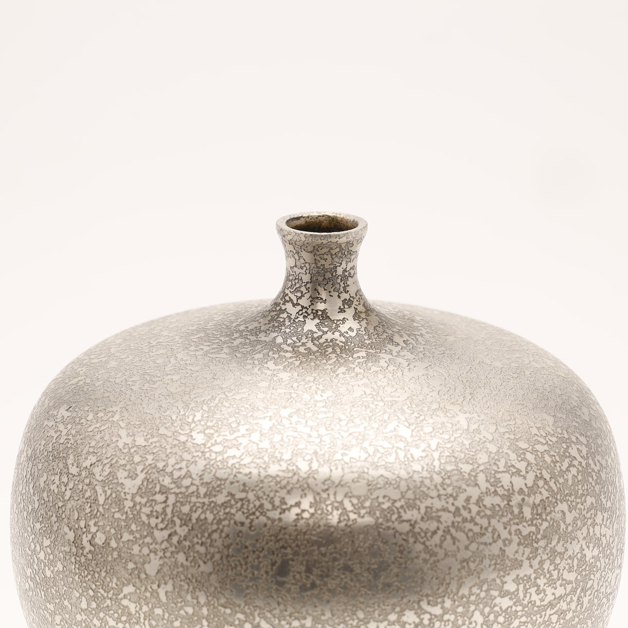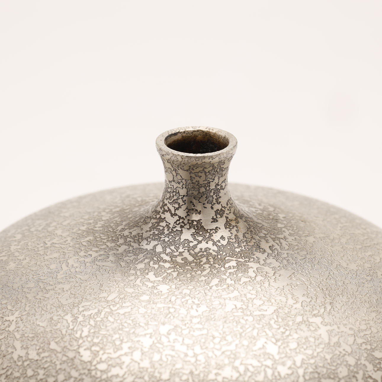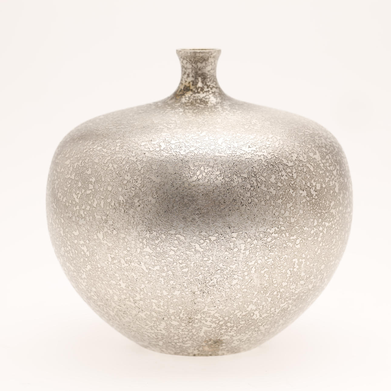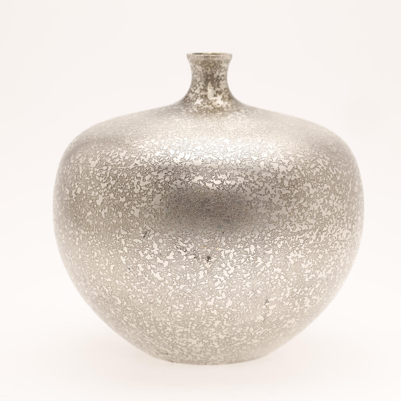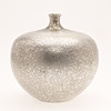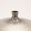 A vintage Japanese bronze vase in silver color. The surface is decorated with “cracked” pattern. The apple-shaped body has a plump throat and a tiny mouth. Unsigned.