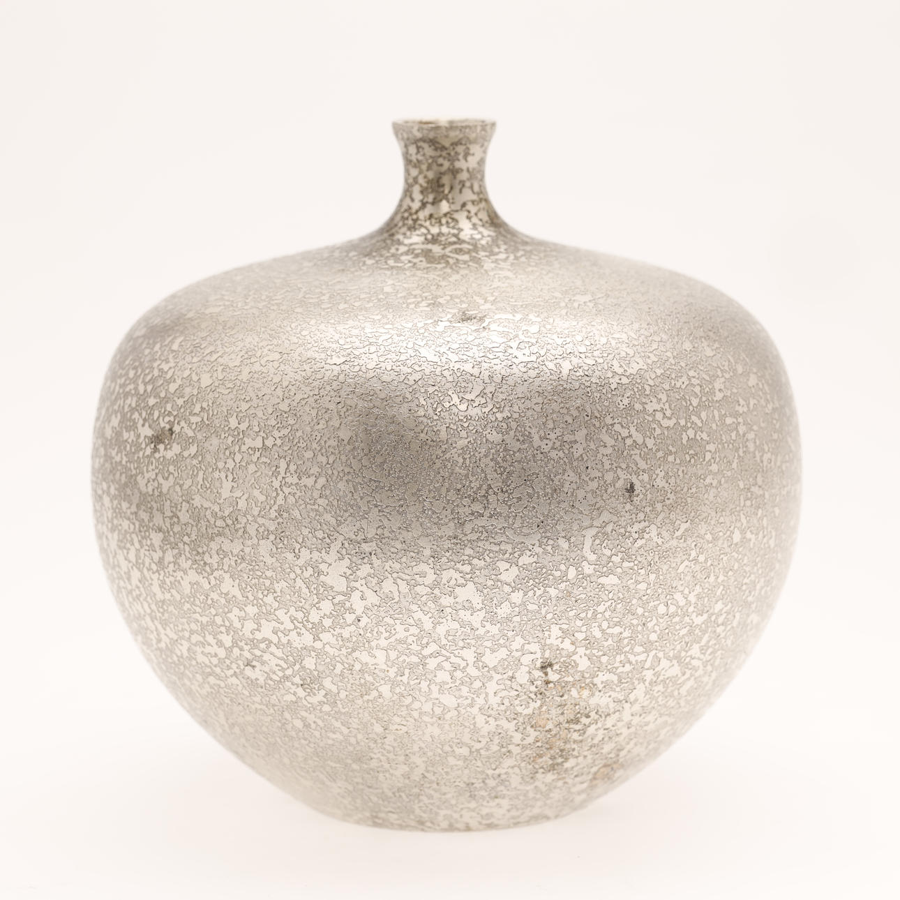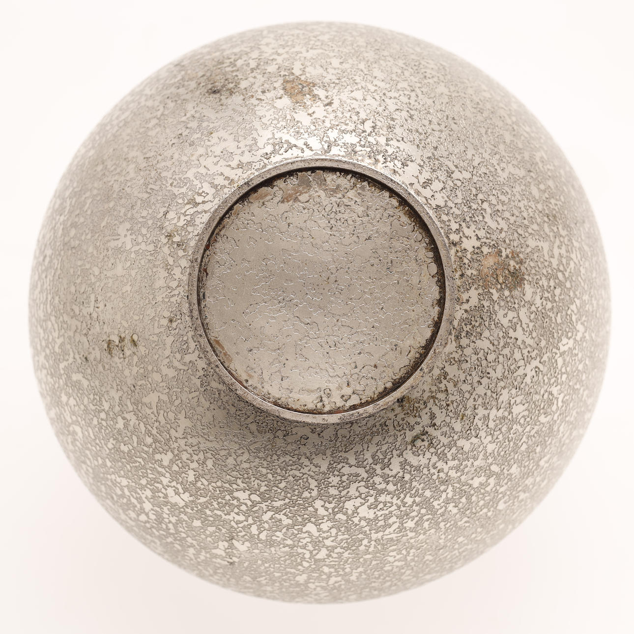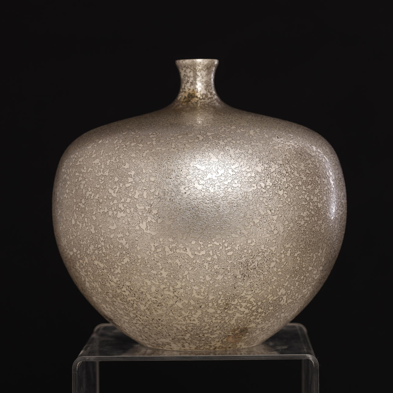 A vintage Japanese bronze vase in silver color. The surface is decorated with “cracked” pattern. The apple-shaped body has a plump throat and a tiny mouth. Unsigned.