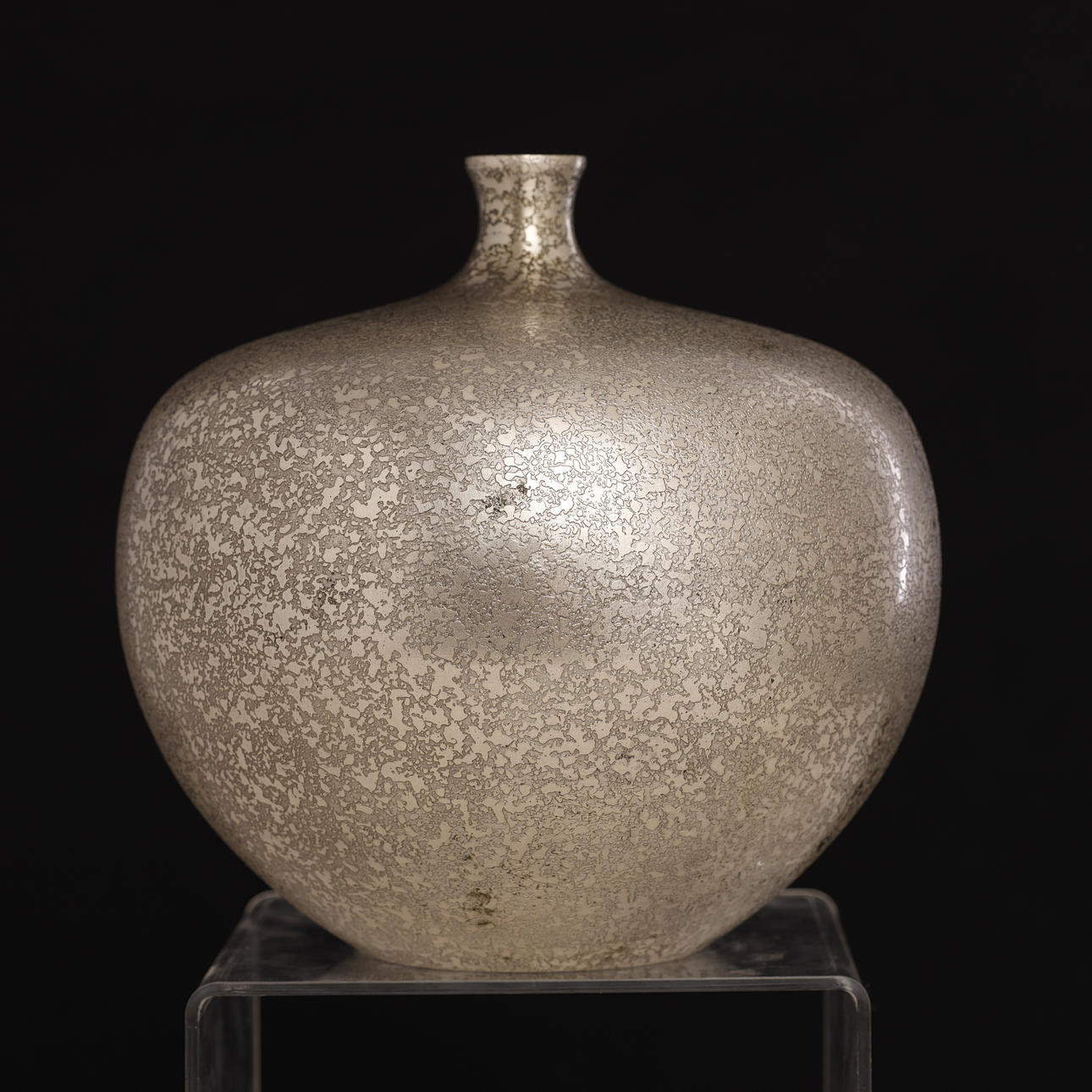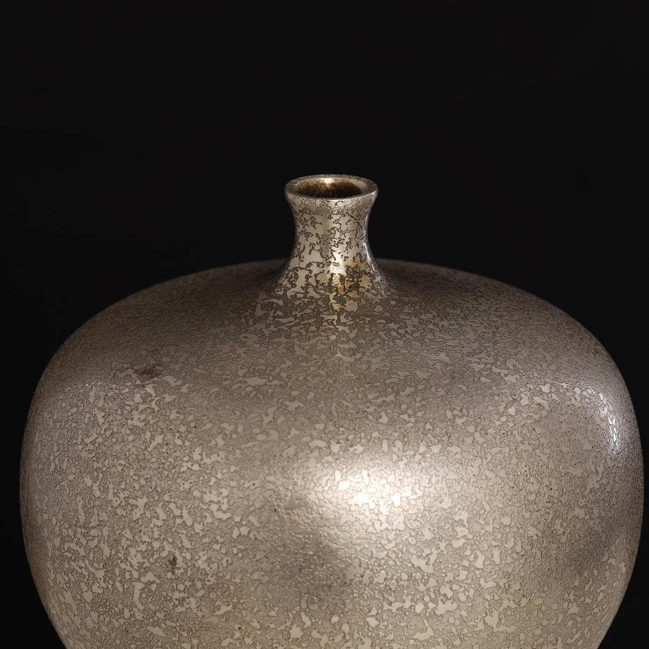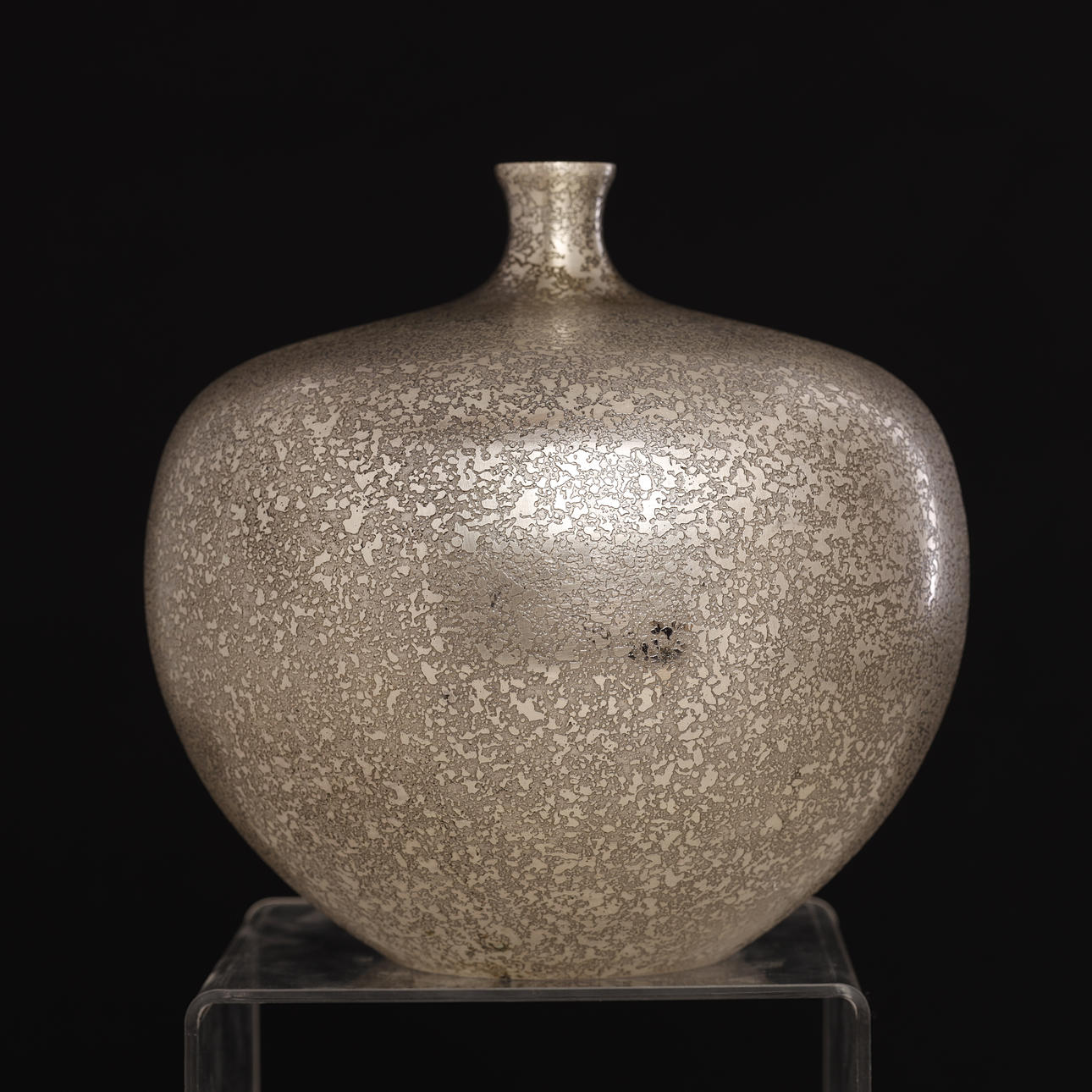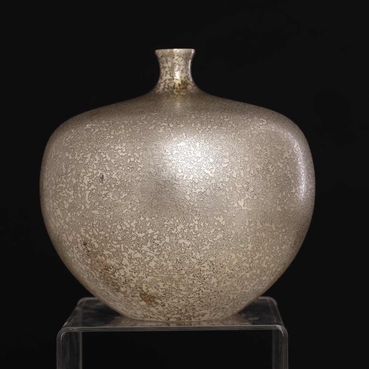 A vintage Japanese bronze vase in silver color. The surface is decorated with “cracked” pattern. The apple-shaped body has a plump throat and a tiny mouth. Unsigned.