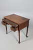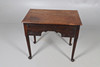 An oak lowboy on straight legs and shaped feet, with three brass handled drawers to the main unit. Height 71cm x Length 79cm x Depth 48cm.