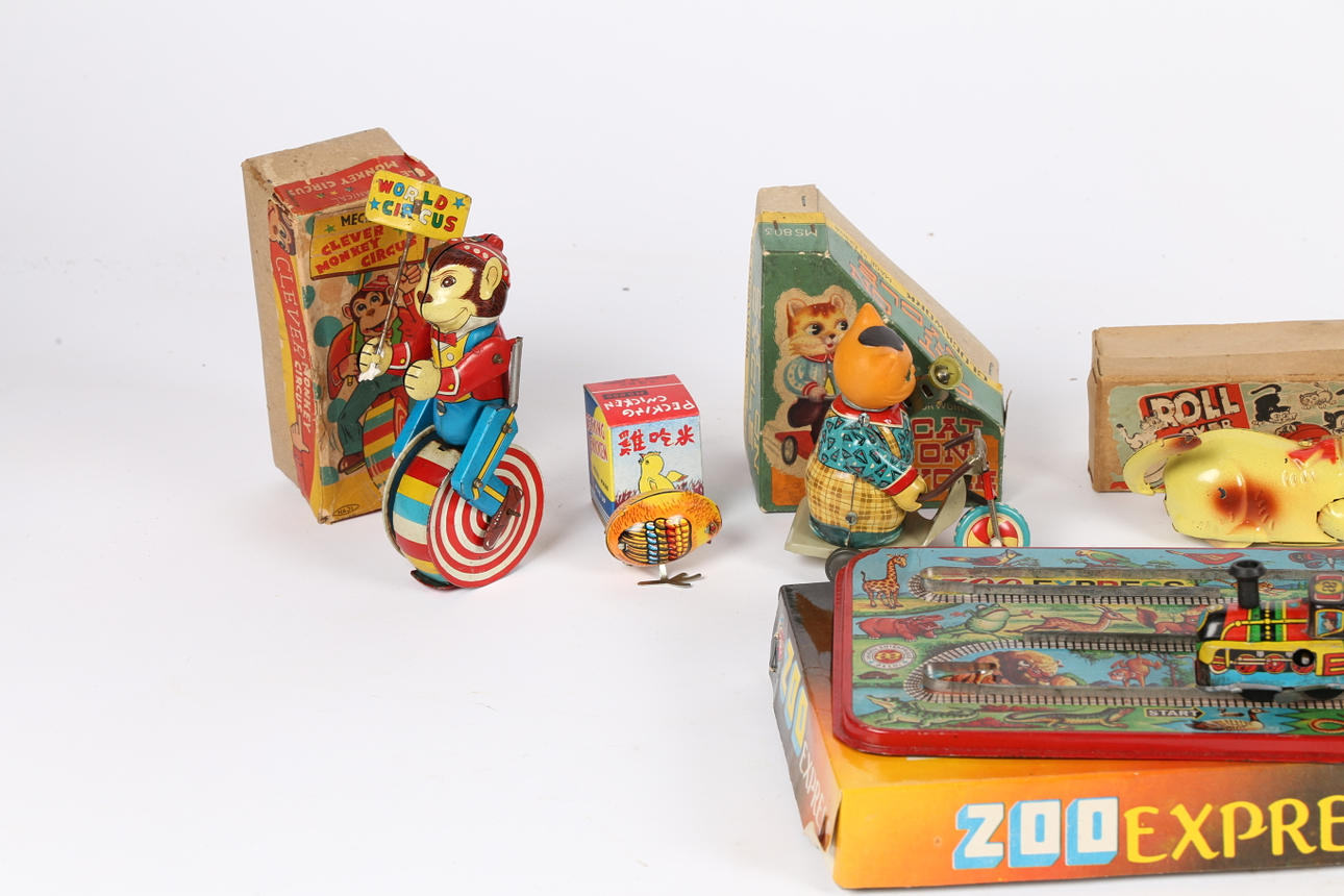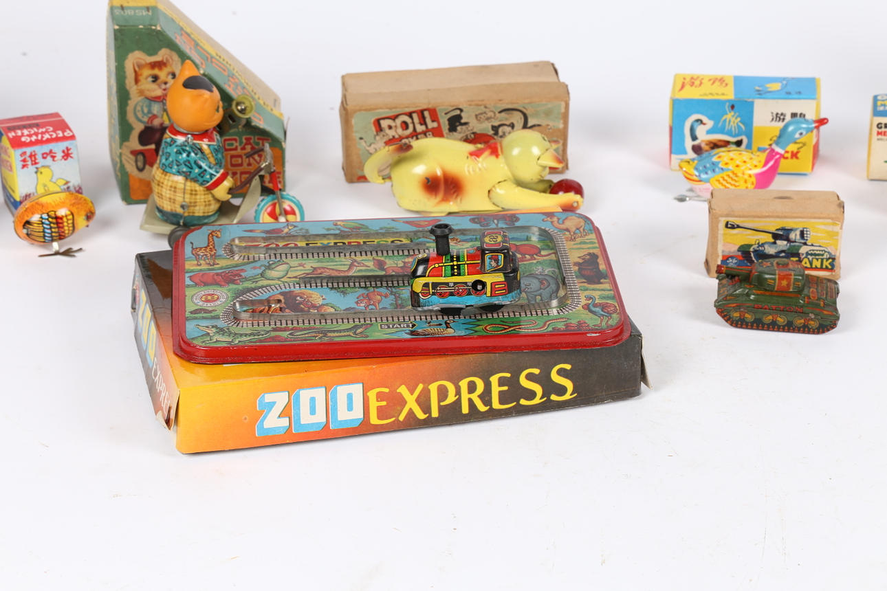 To include a Marx 'Flip Over' Tank, boxed Roll Over Cat, boxed Haji Mechanical Clever Monkey Circus, boxed Clockwork Cat On Cycle (MS 803), boxed General Patton Baby Tank, boxed Wind-Up Toy Jumping Zebra, boxed 'Zoo Express', etc. (10).