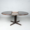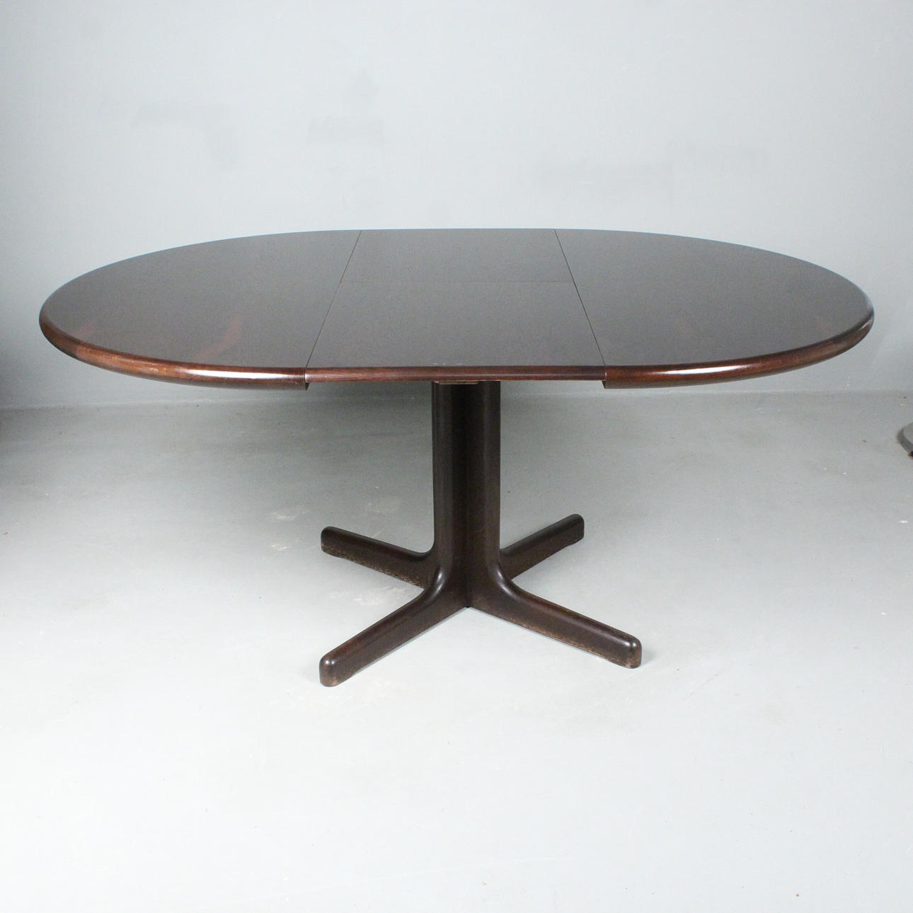 Lübke, Germany, round table/dining table, expandable with an internal plate, dark stained wood construction, with manufacturer's label,