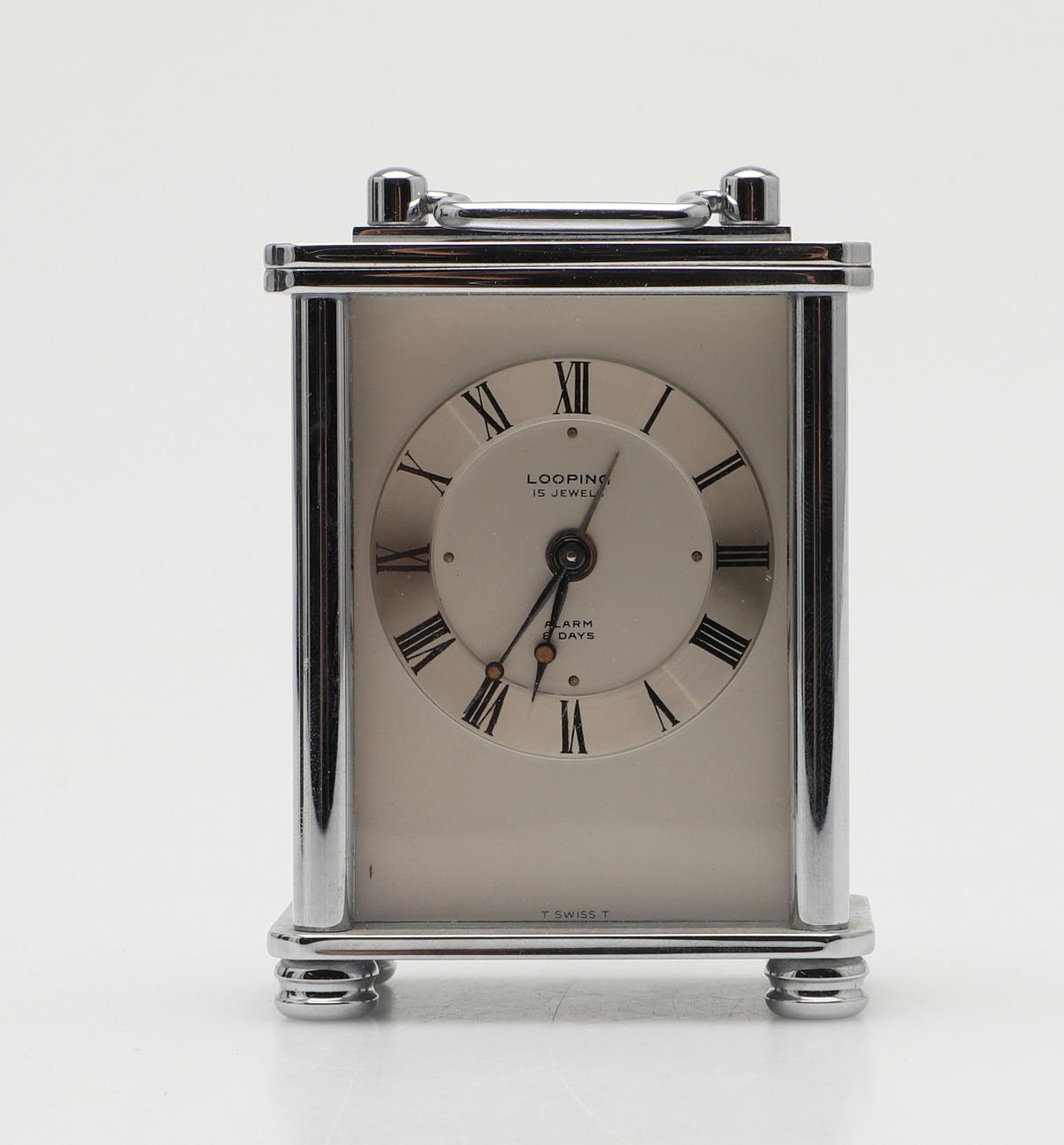 with a chrome finish and a swing handle, the silvered dial with Roman numerals, with retailers name "LOOPING" and with a Swiss movement; the case 3.75" (9.5cm) high.
