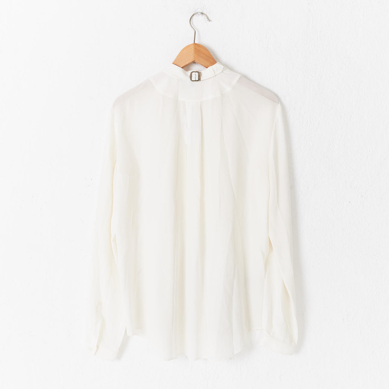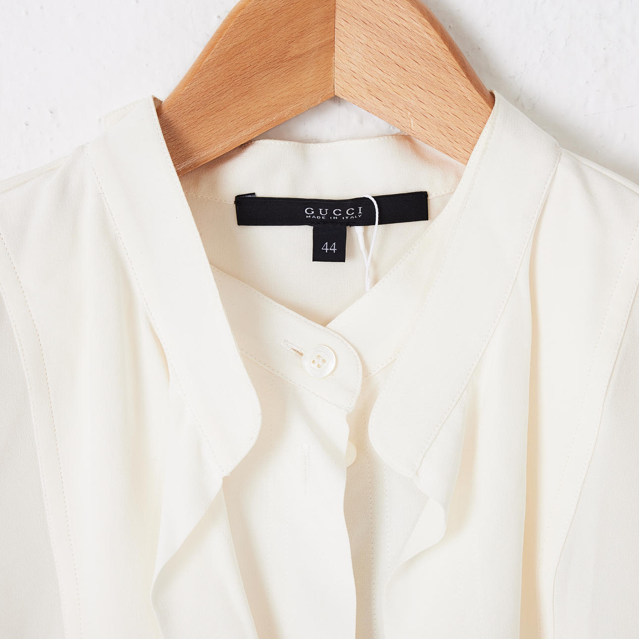 White silk, with coat shirt closure at the front and a small silver buckle at the neck, marked “GUCCI made in italy”, enl marking italian size 44.