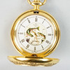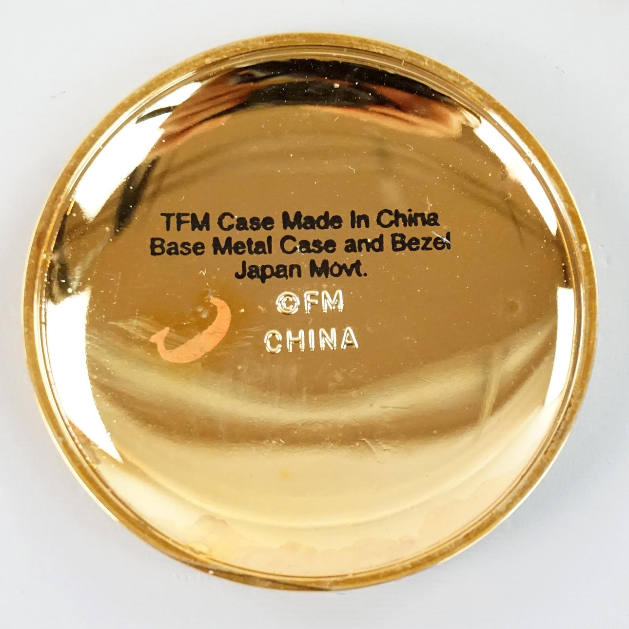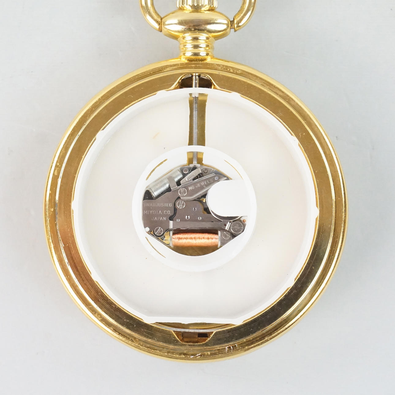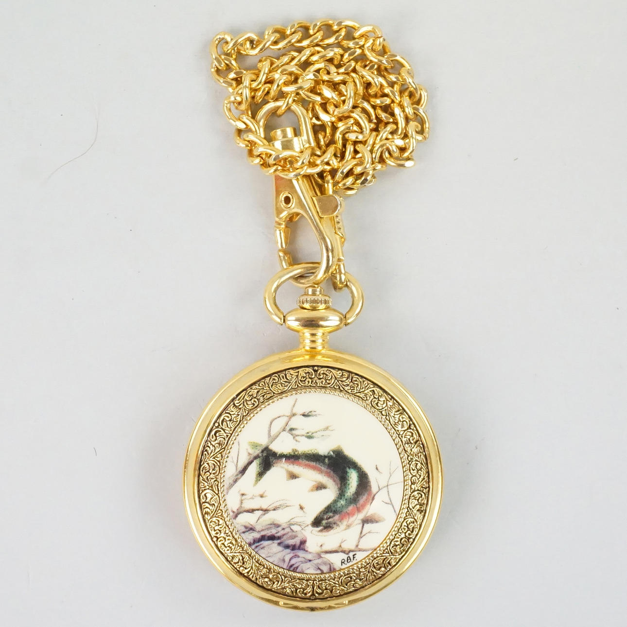 Decor of fish on the case and dial. Japanese clockwork. Diameter approx. 5 cm. Case and chain in yellow metal.