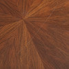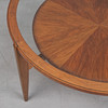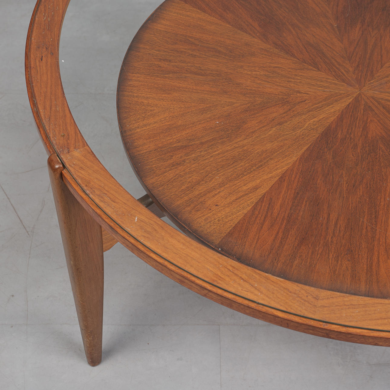 Glazed walnut veneer construction with four braced legs and a round, loosely placed glass table top, h.53cm, d.104cm.