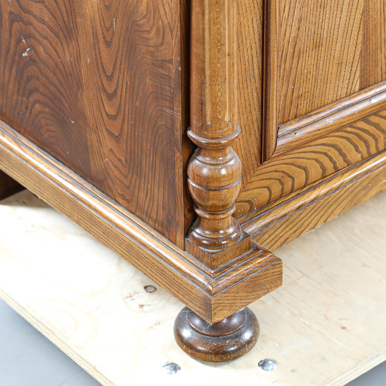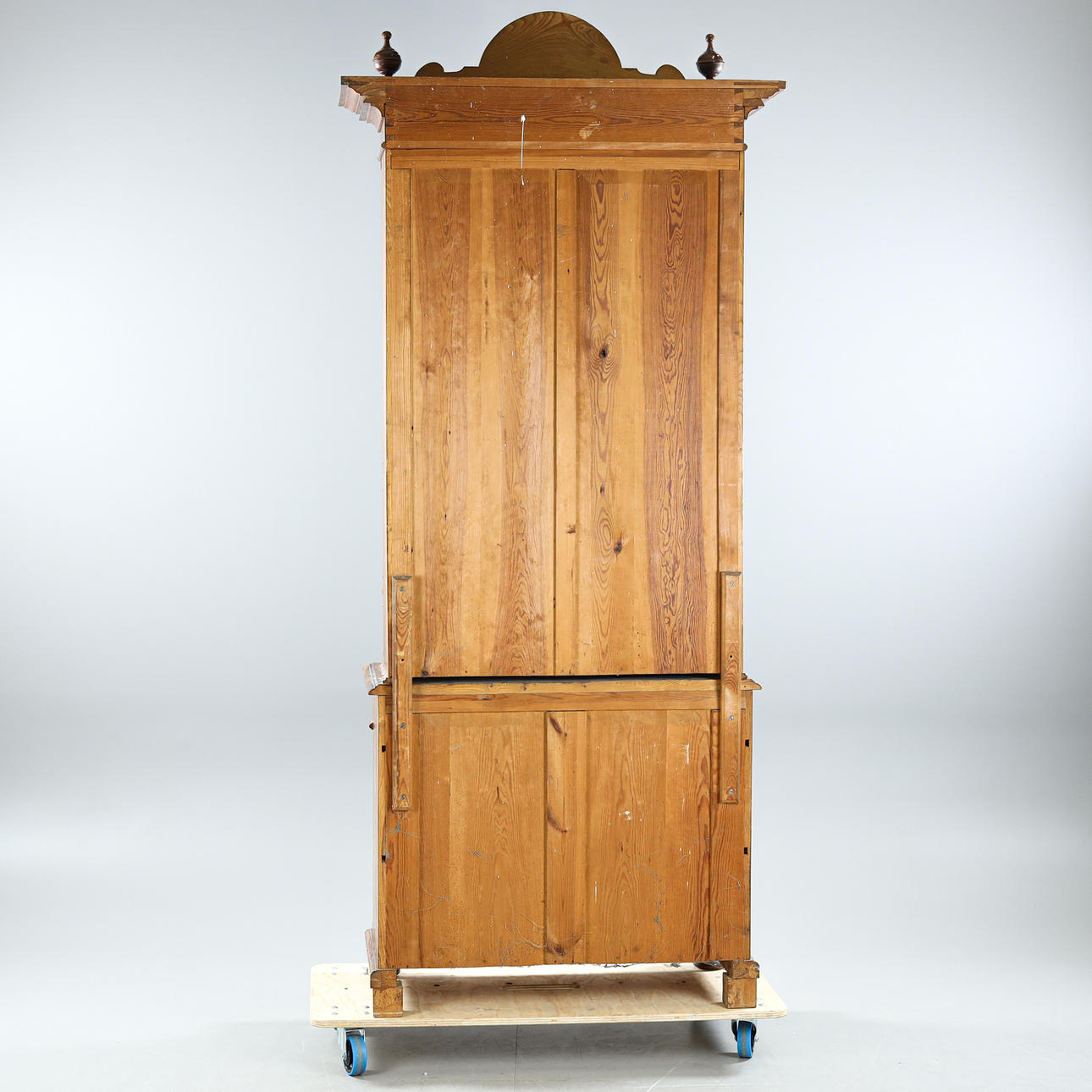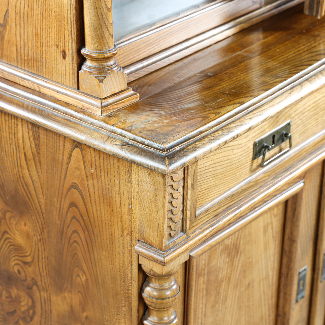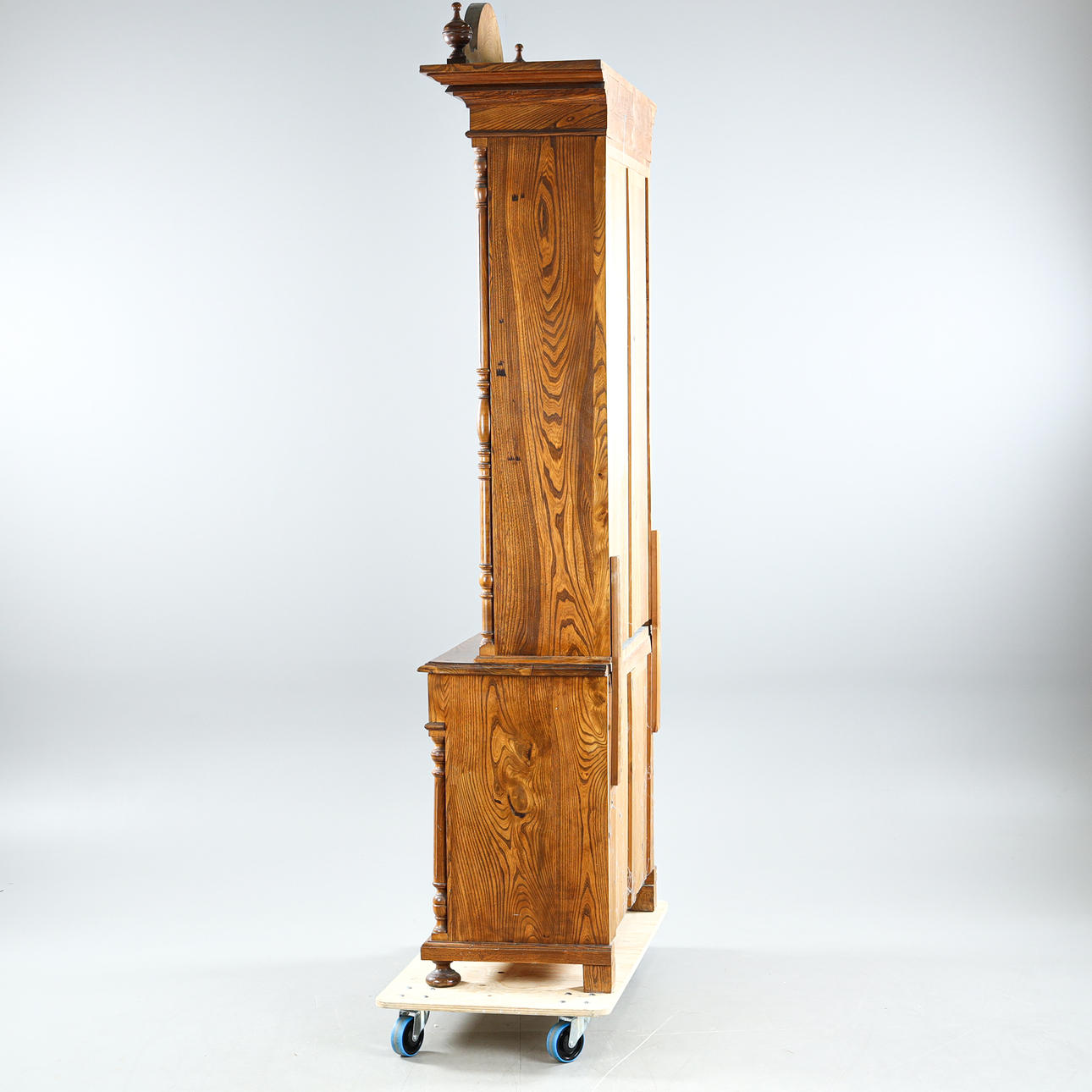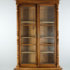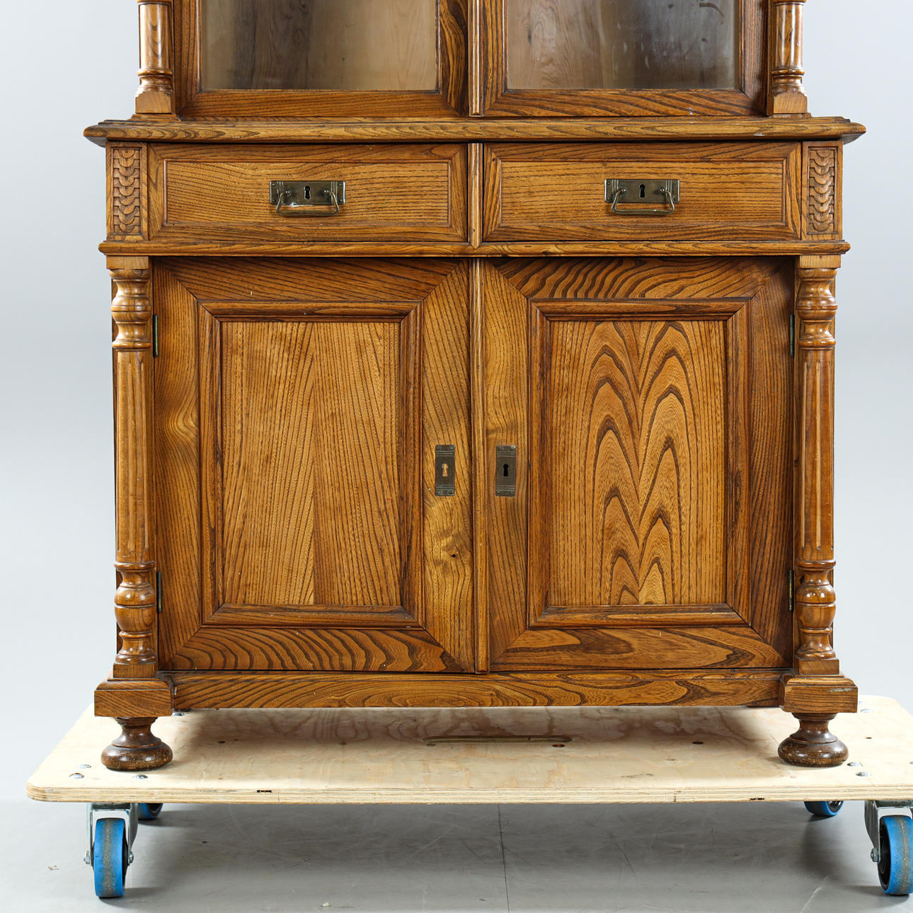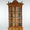 Veneered in oak, cut decor, brass fittings, interior with shelves, height approx. 254, 98x50 cm.