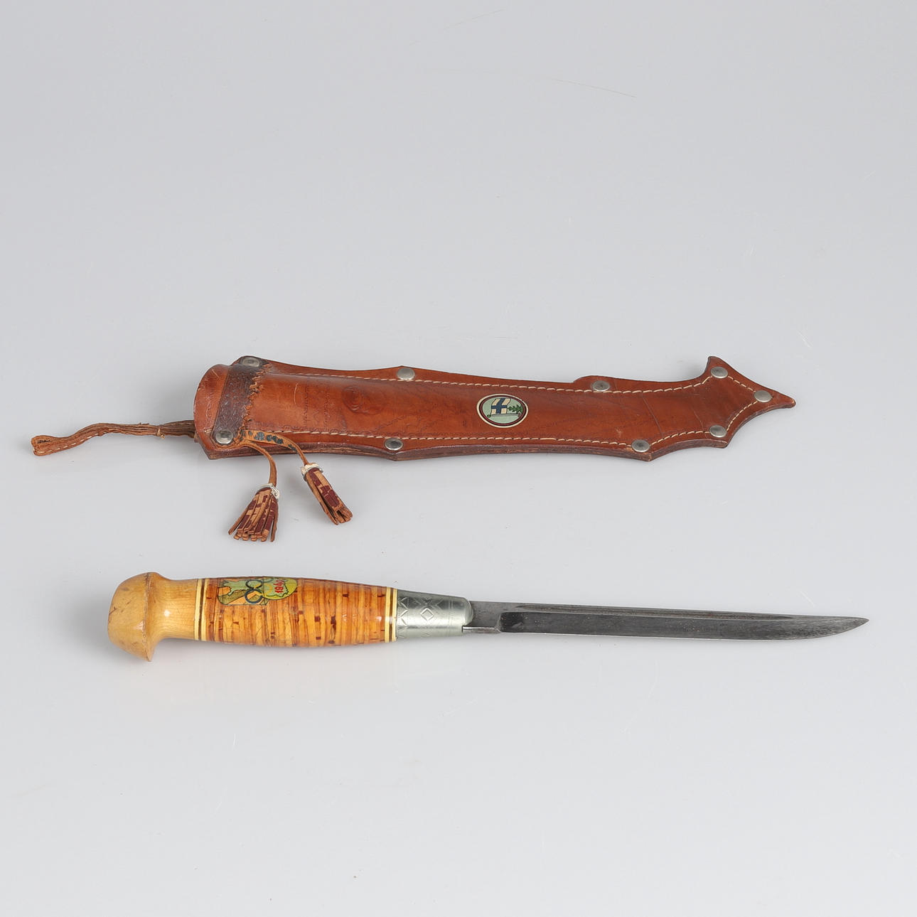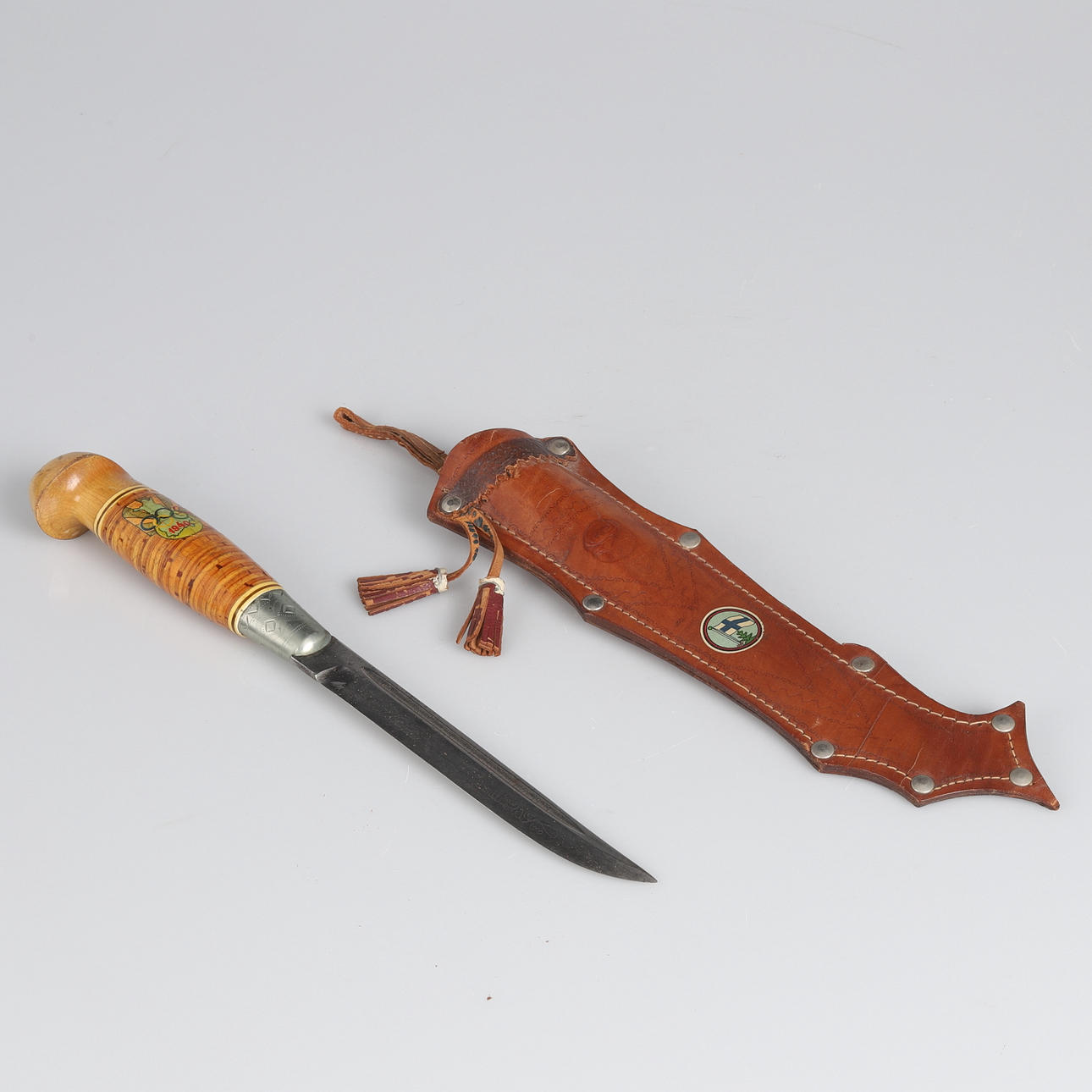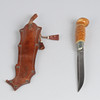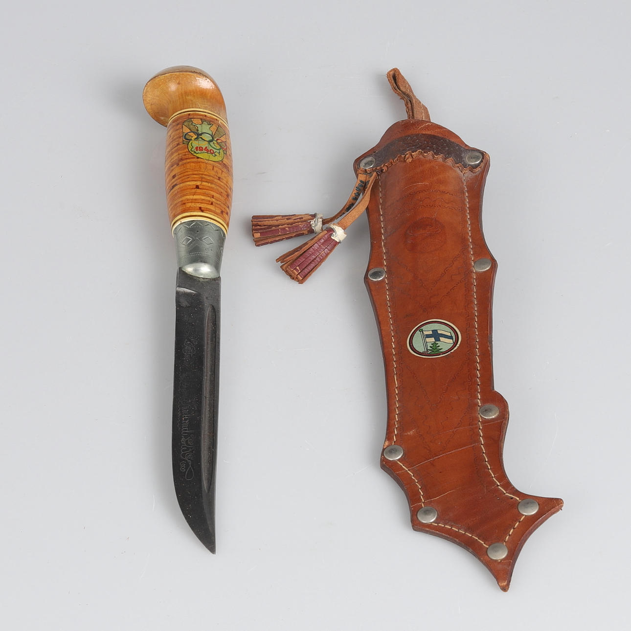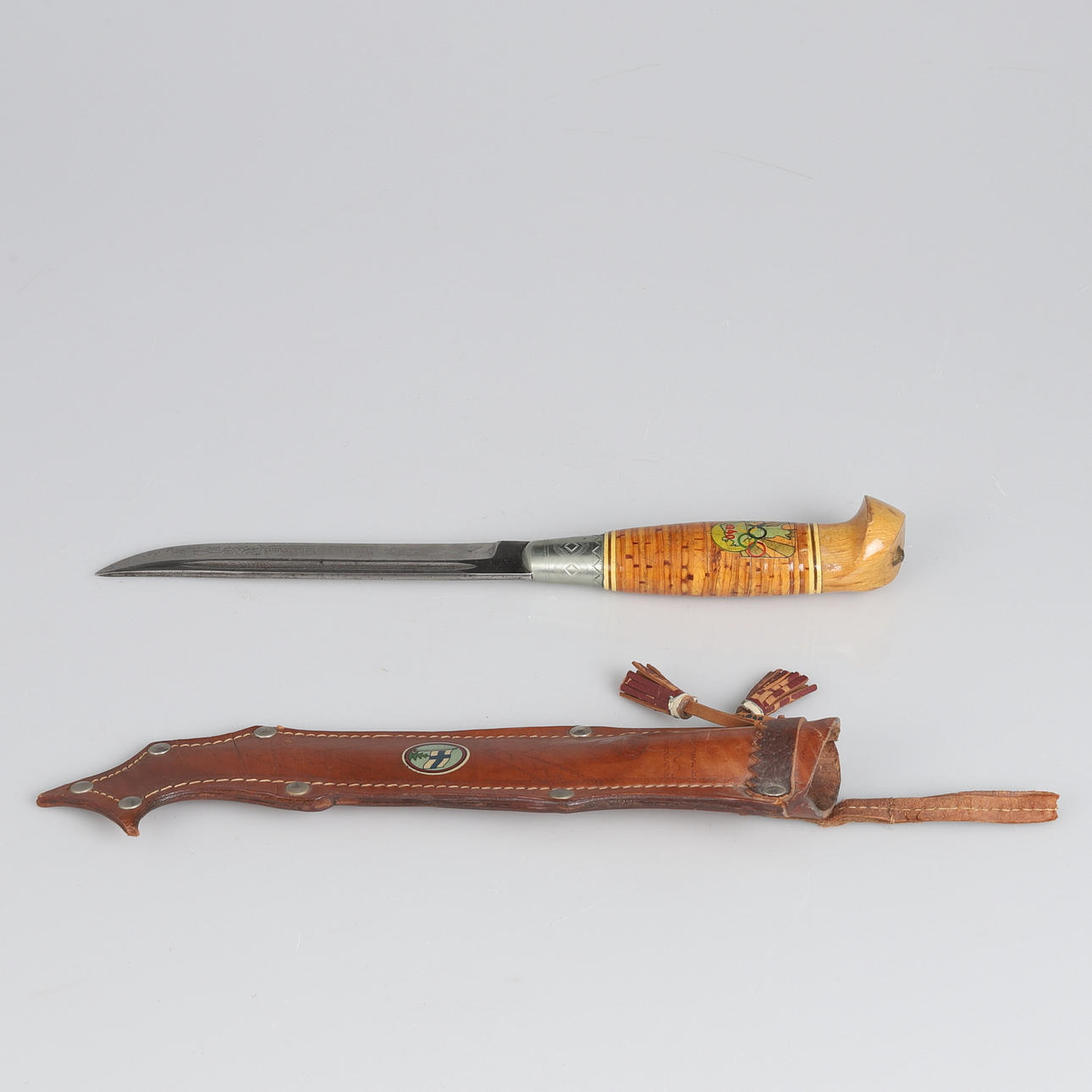 Finnish knife with birch handle and leather sheath with embossed decoration. Produced as a souvenir for the cancelled 1940 Summer Olympics in Helsinki. Sheet marked Made in Finland.