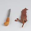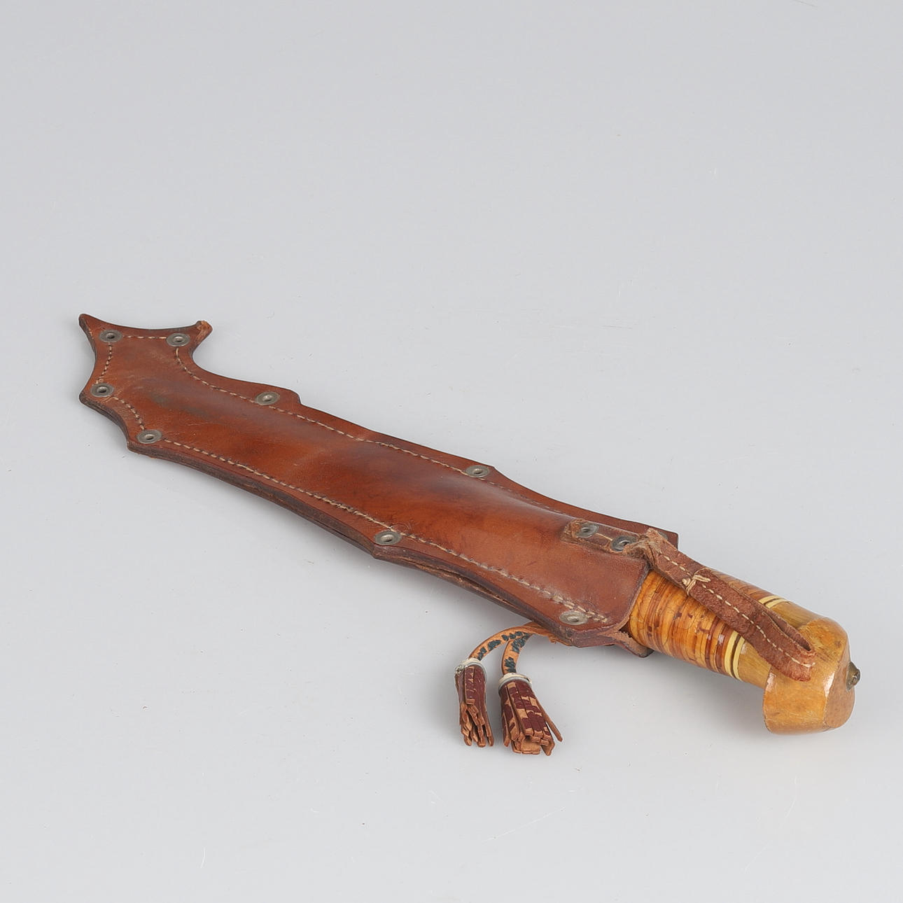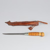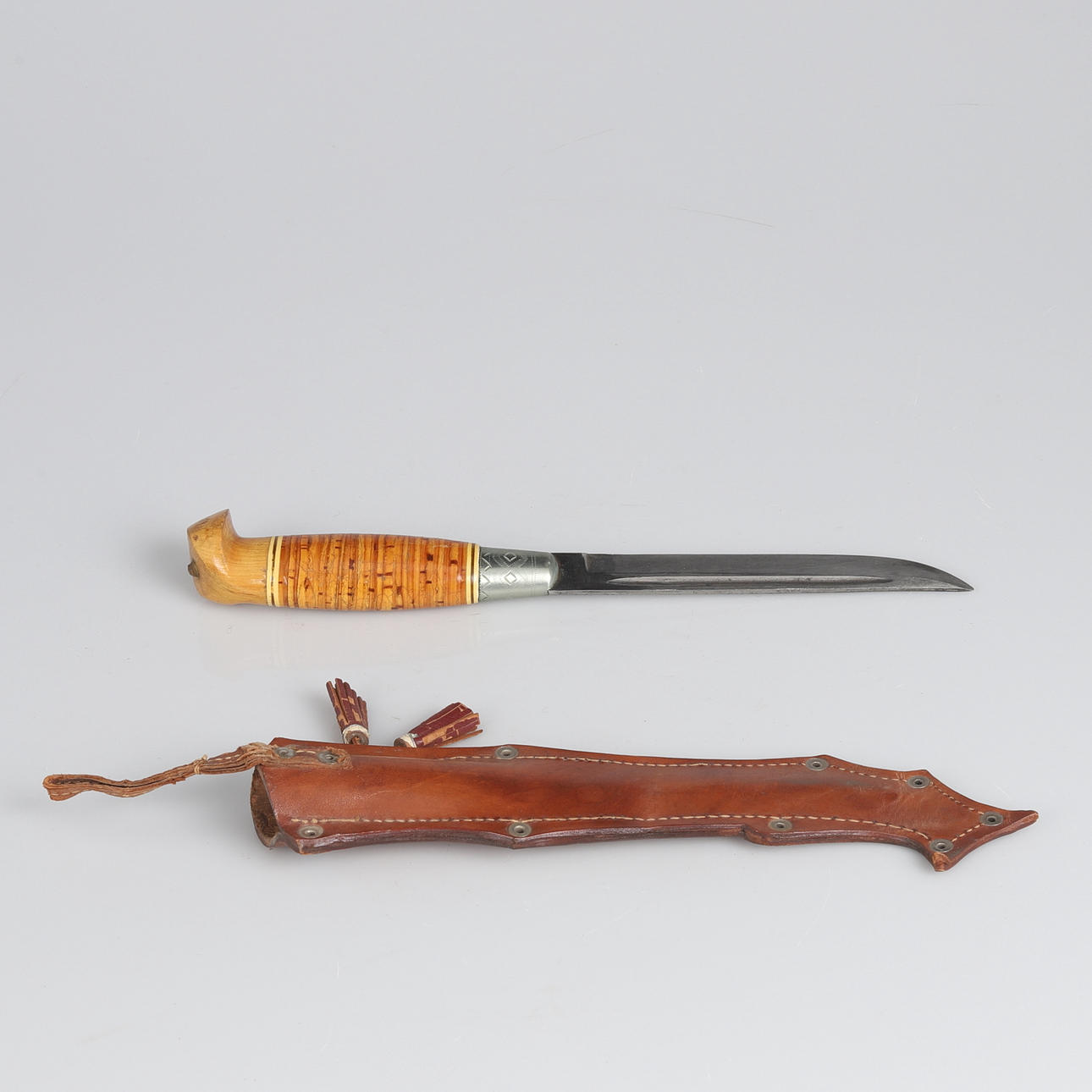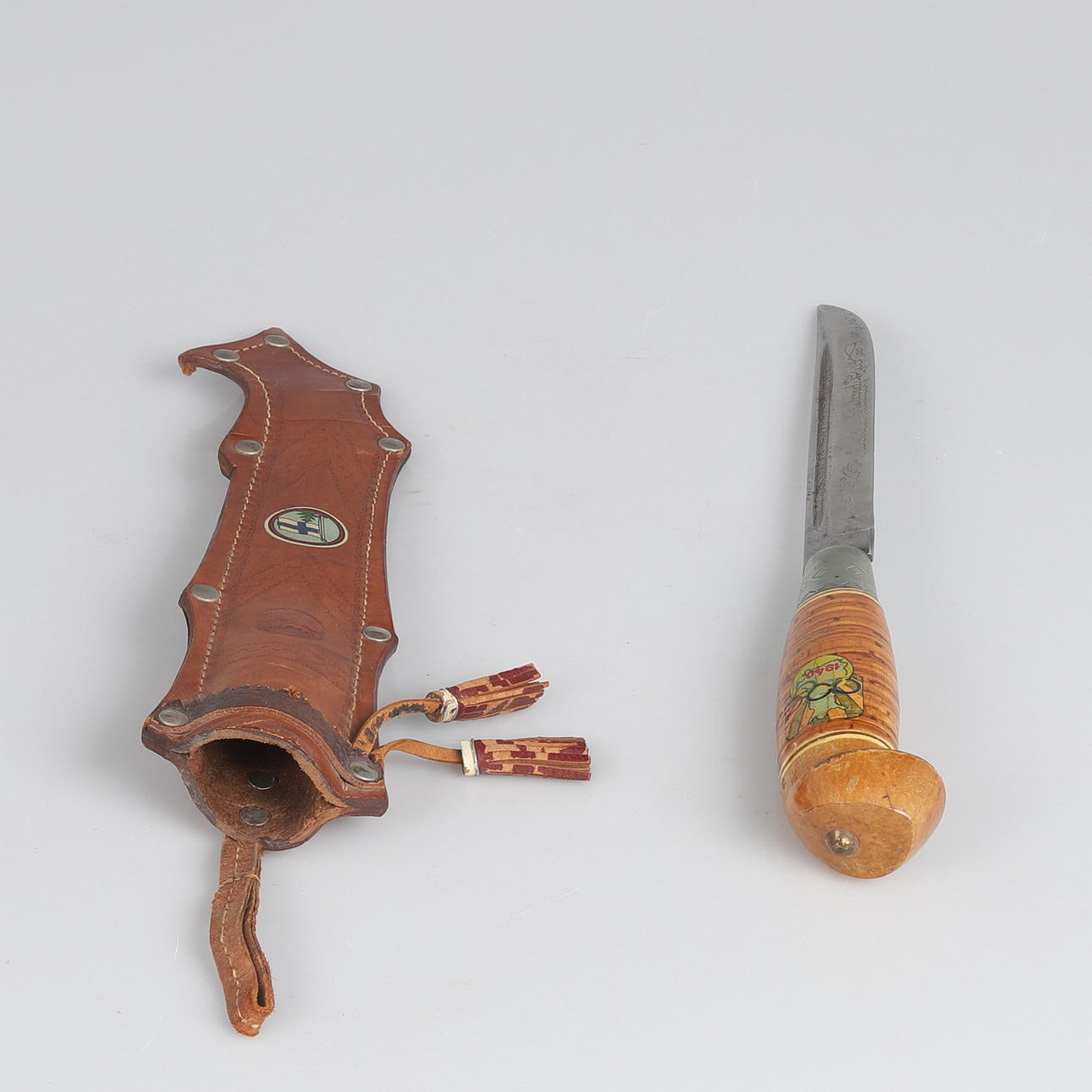 Finnish knife with birch handle and leather sheath with embossed decoration. Produced as a souvenir for the cancelled 1940 Summer Olympics in Helsinki. Sheet marked Made in Finland.