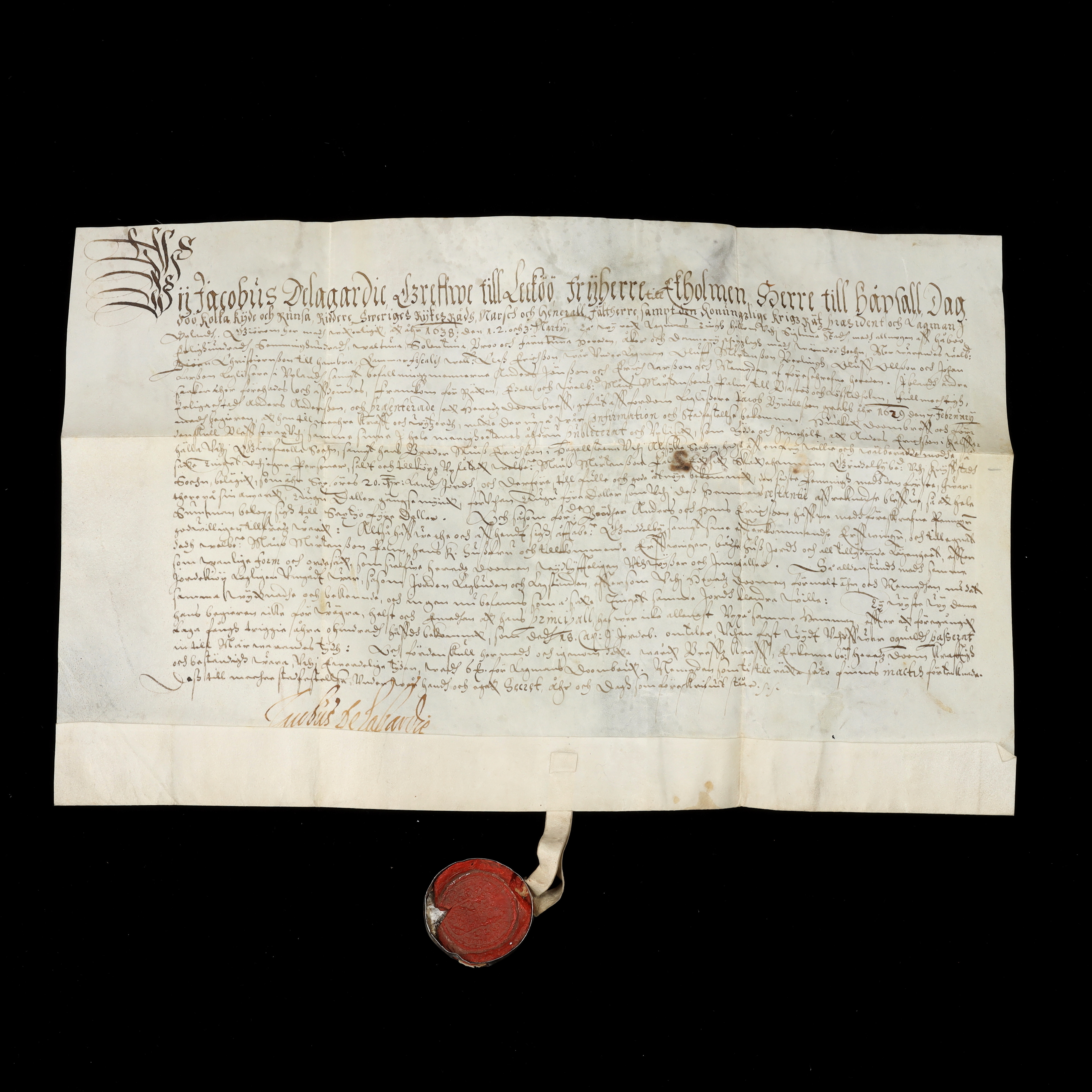 3489383. JACOB DE LA GARDIE. Signed document, 1638.