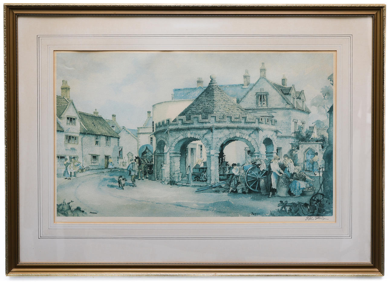 artist signed coloured print, mounted and framed, 75cm x 103cm overall.
