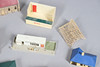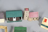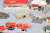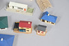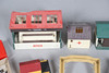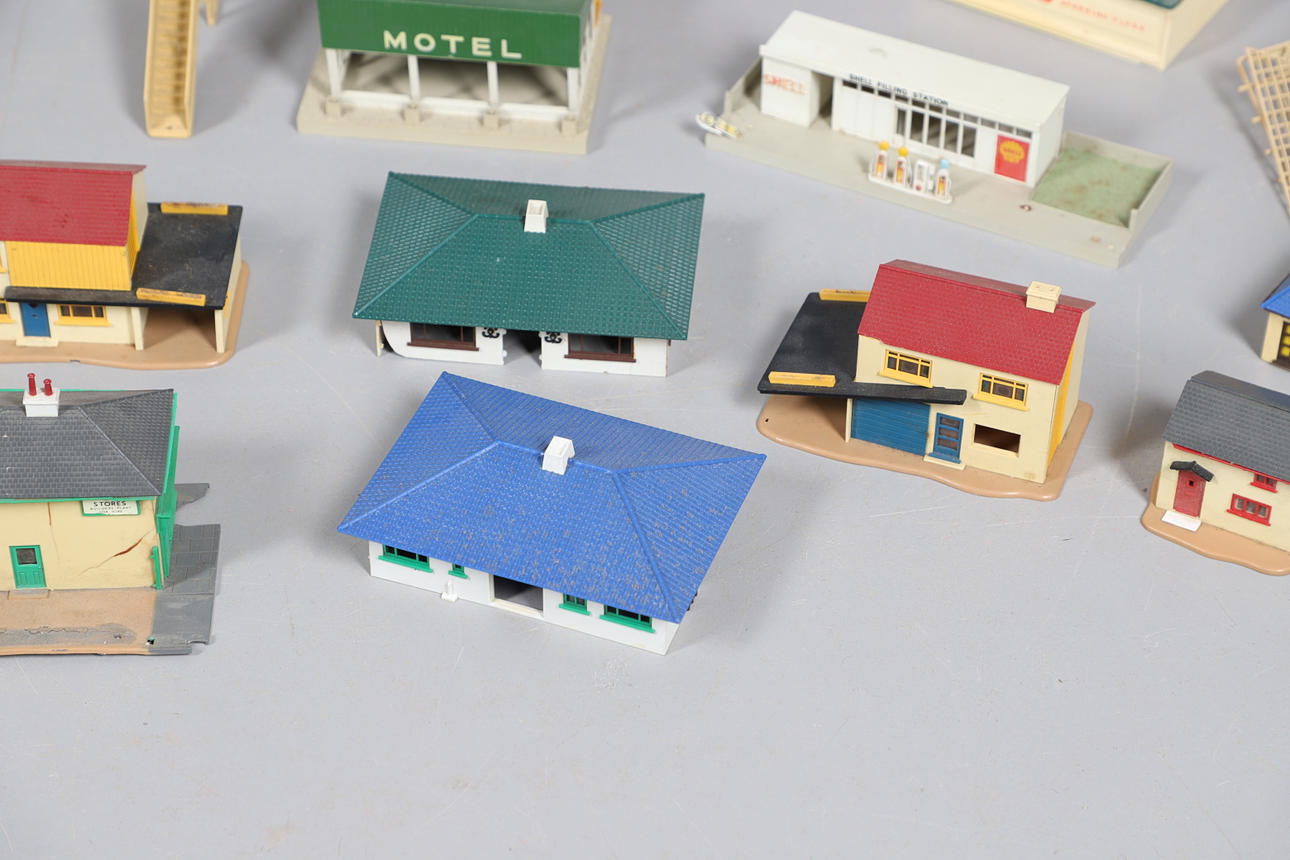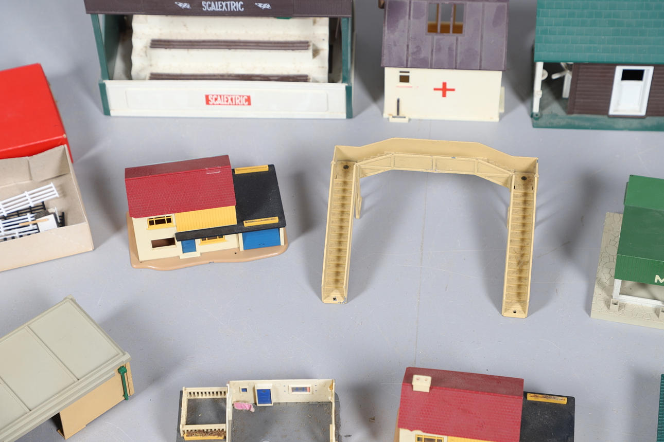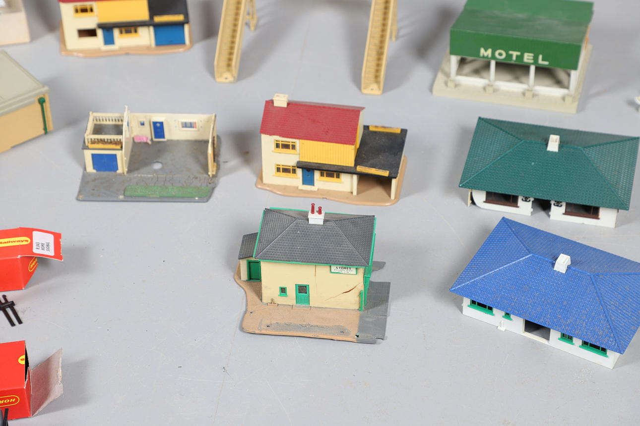 A mixed lot including five boxed Hornby wagons, various model buildings for a layout, and a Scalextric grandstand etc.