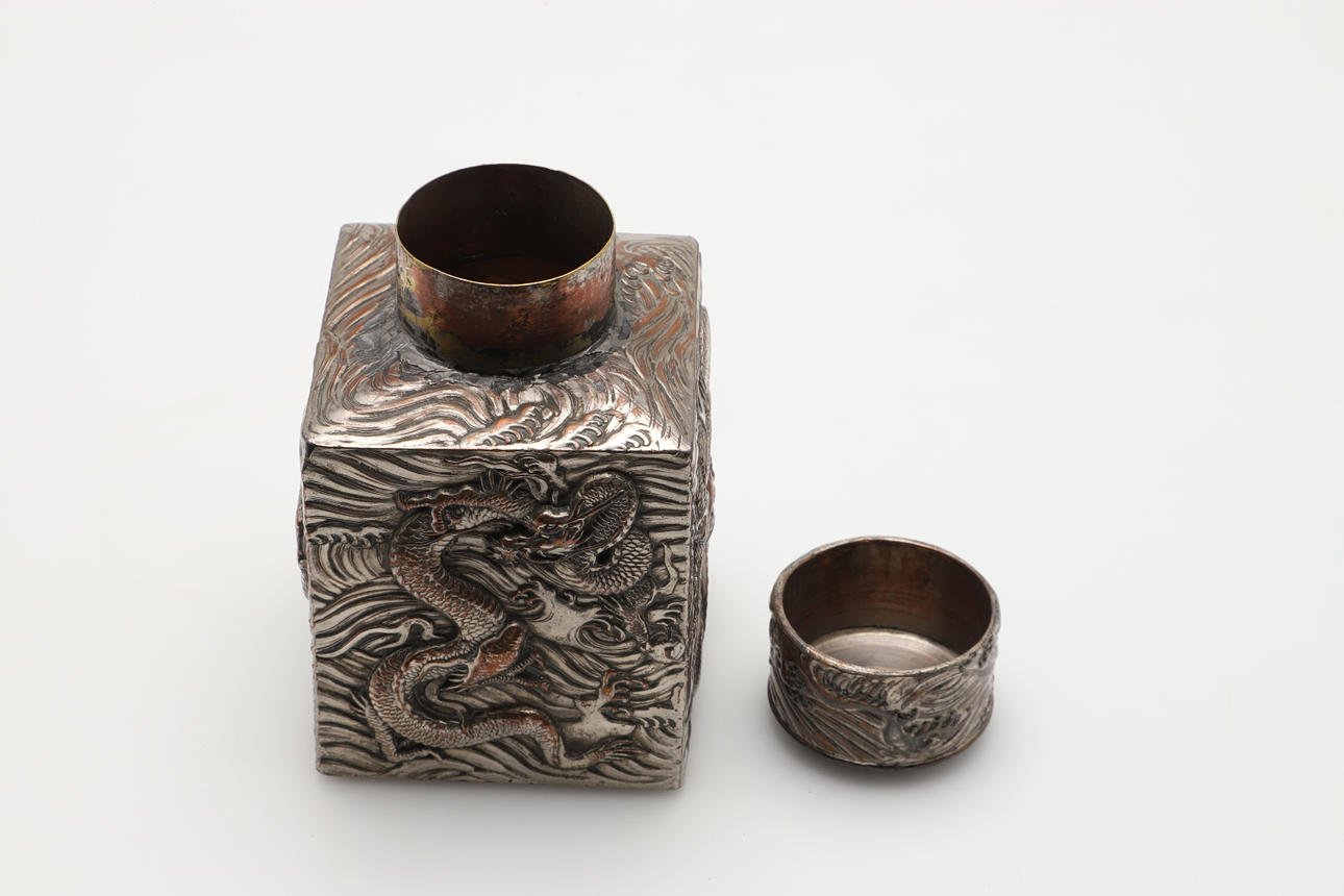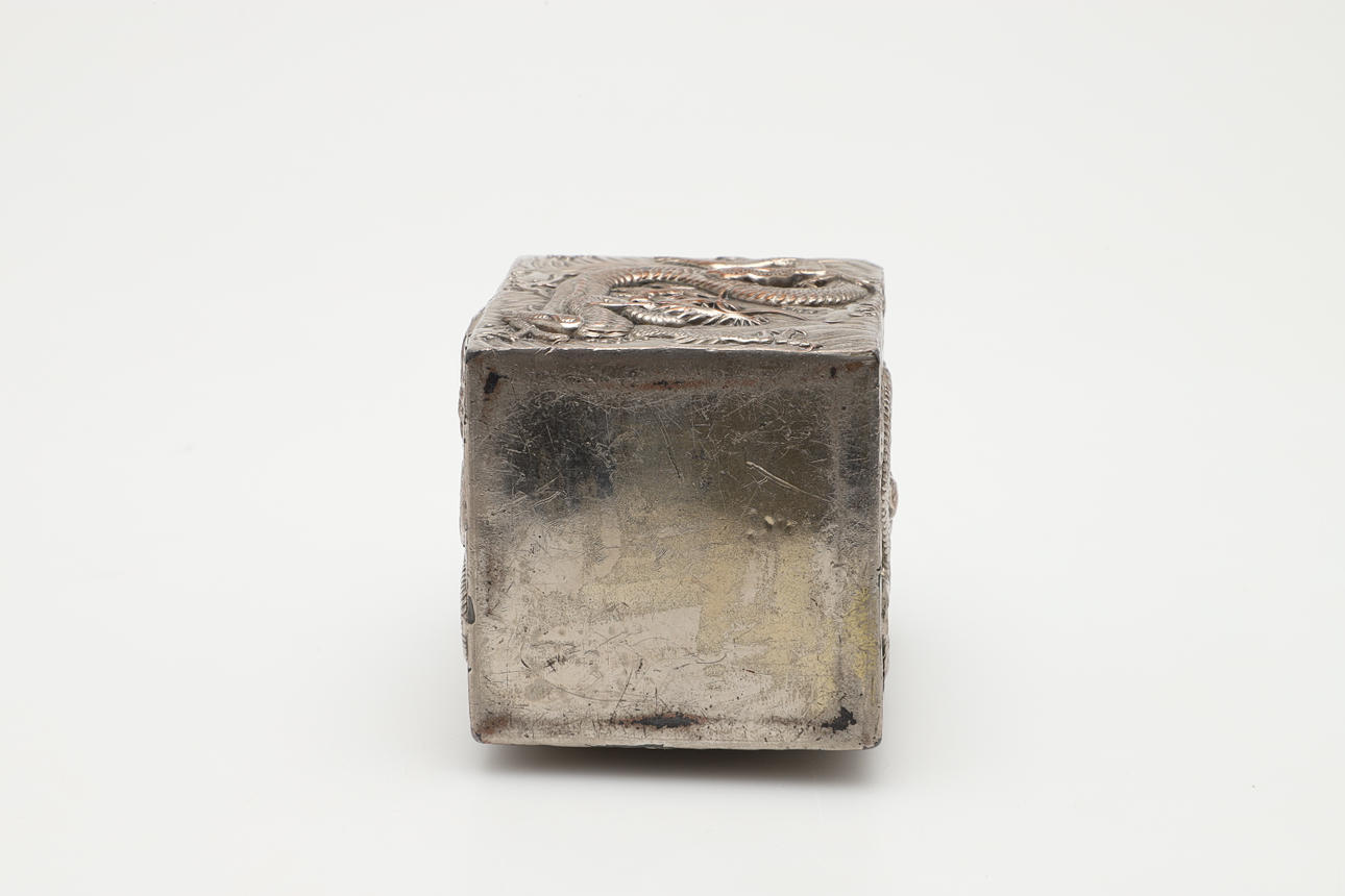 Of square form, decorated in relief with Chinese dragon design. Height 12cm x Body 7.5cm².