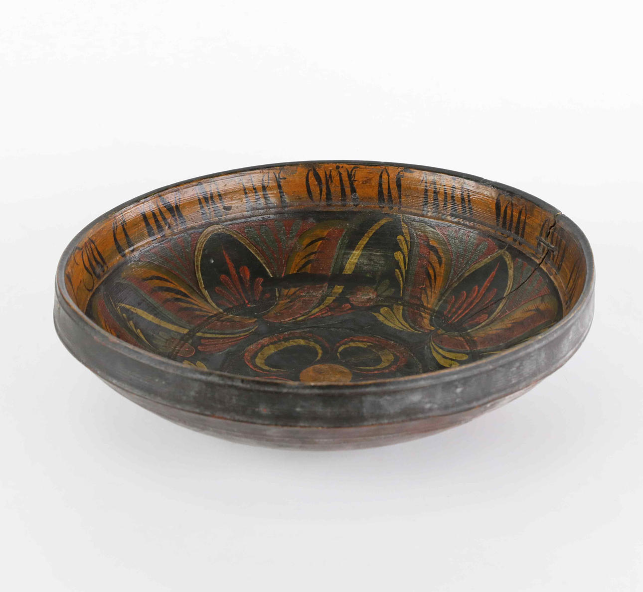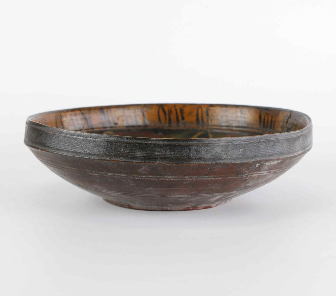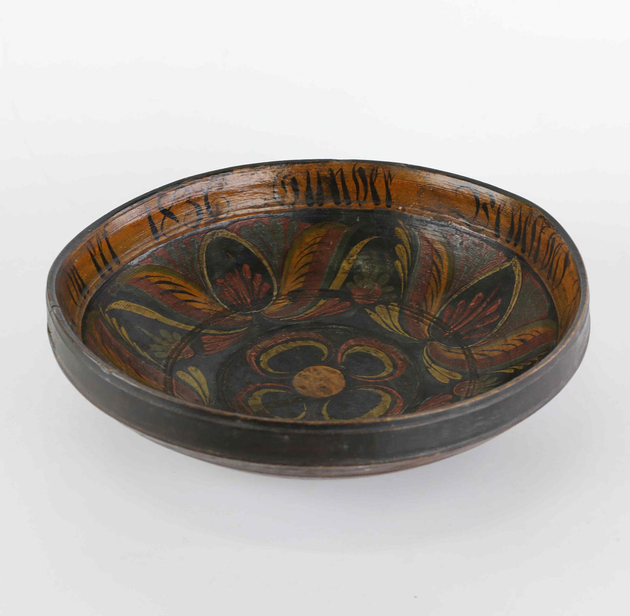 Round bowl. Interior painted with decor, as well as writing and dating.