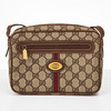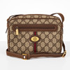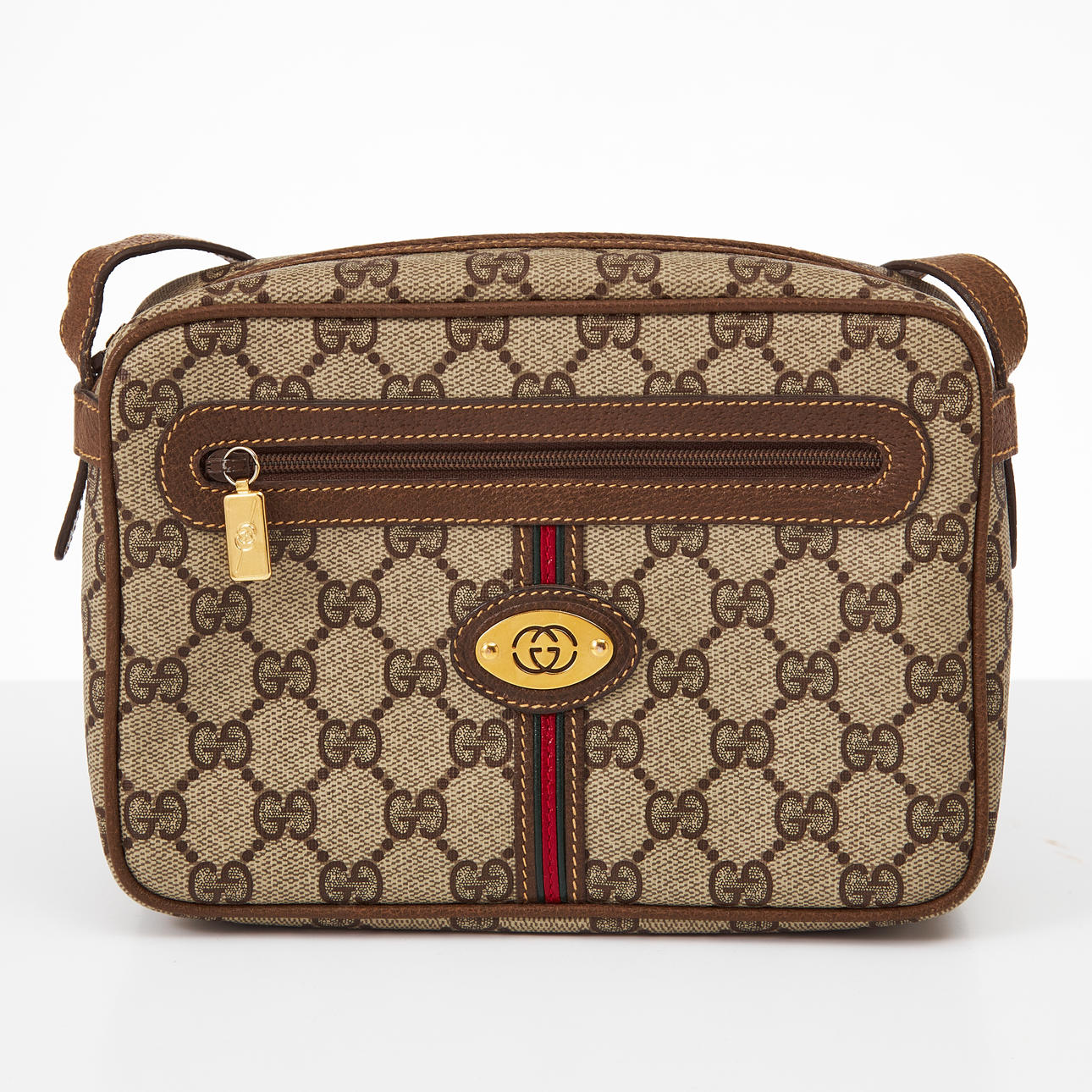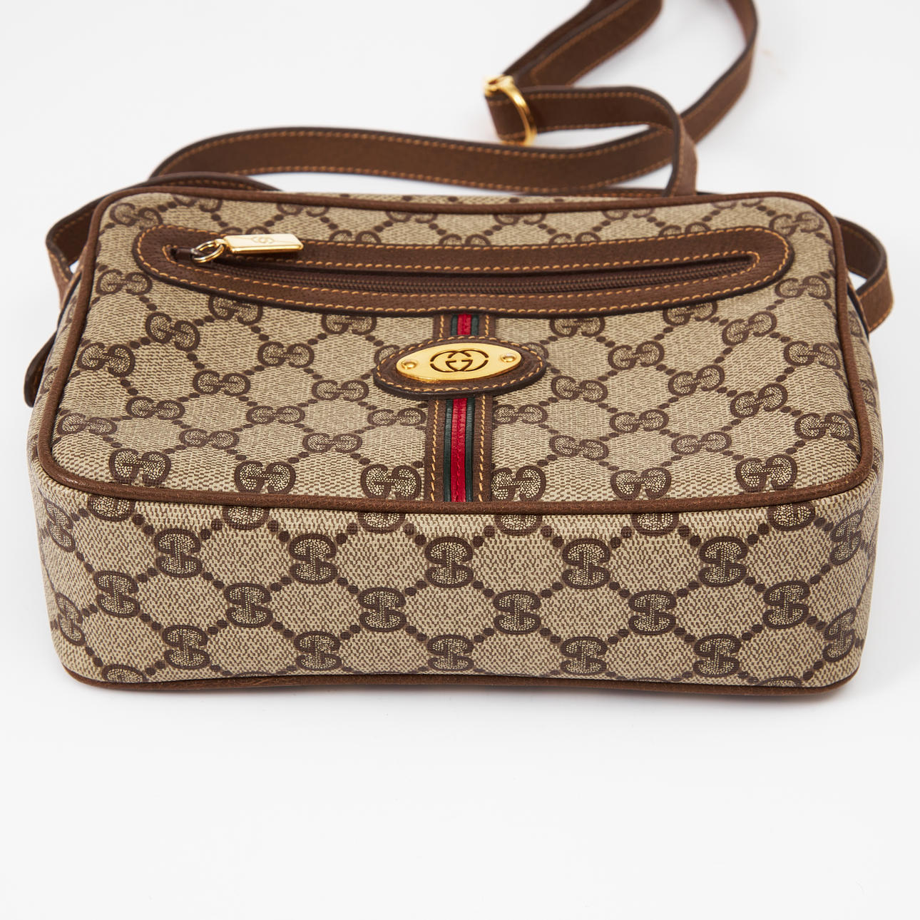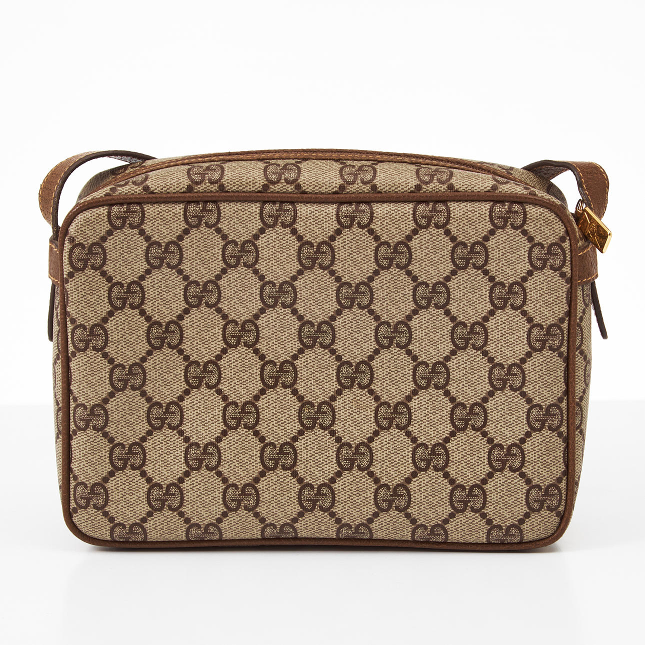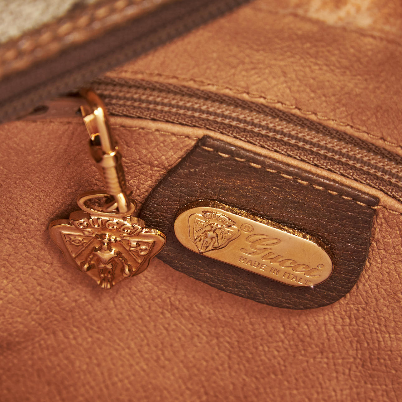 Monogram canvas with brown leather details and gold-colored fittings, inside a compartment, sign marked Gucci, Made in Italy.