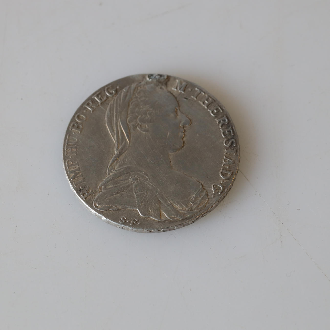 Avers: Bust of Empress Maria Theresia of Habsburg facing right, bearing veil, tiara and pearl brooch. With the Latin text “M · THERESIA · D · G · R · IMP · HU · BO · REG ·