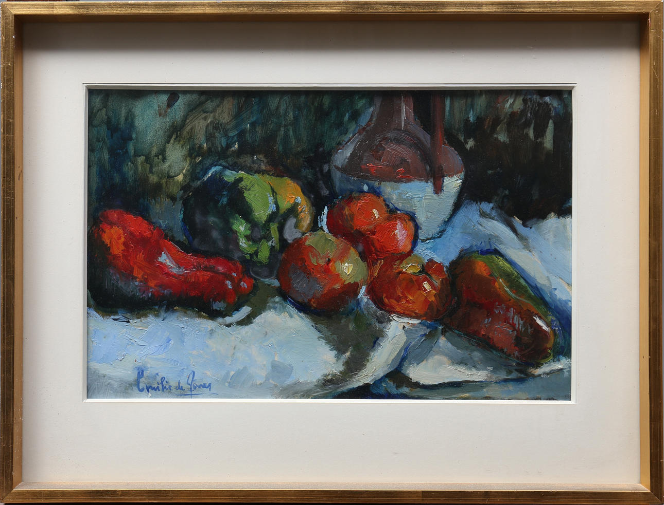 Emília de Torres's compositions focused on still lifes and floral motifs. Her style is mainly Impressionist, but with a Fauvist touch that distinguishes her from other more conventional landscape painters.