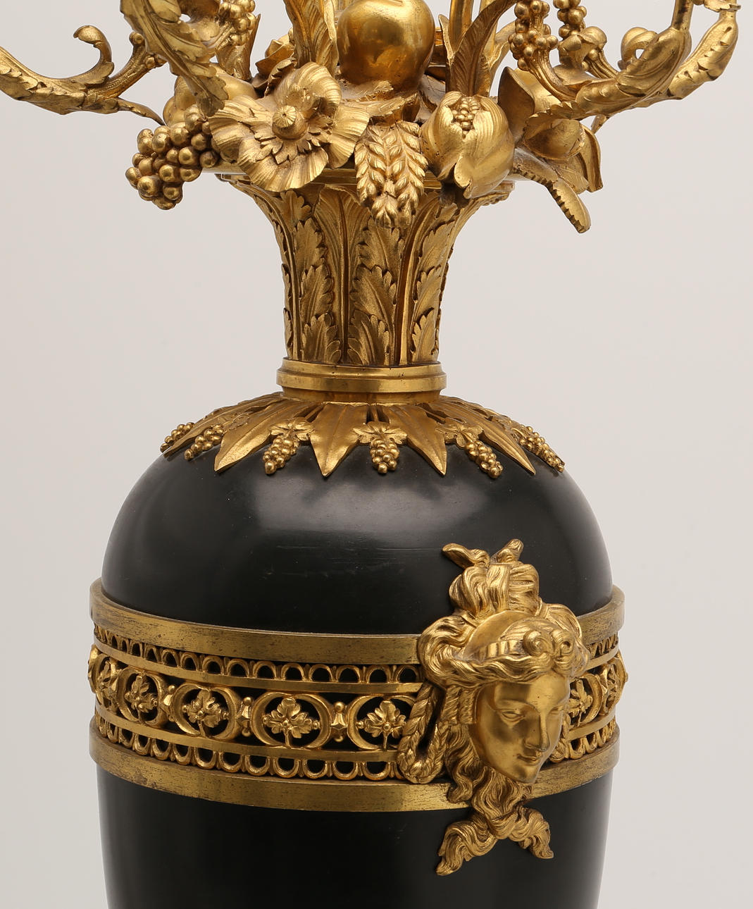 Gilded and patinated bronze. Urn-shaped. Decoration of fruits, flowers and leaves. Signed "Henry Dasson 1877". Height 58, height including screen 86 cm.