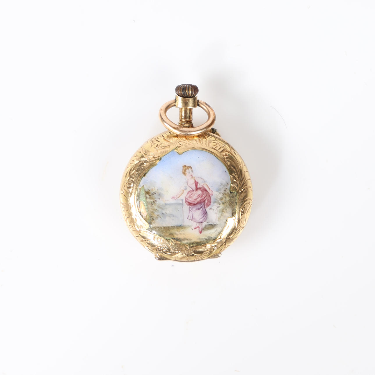 A early 20th century gold cased pocket watch, a white enamelled dial with Roman numerals. The case face with a hand painted enamel scene depicting a young lady in 18th century dress.