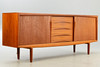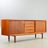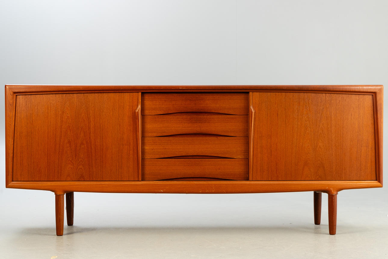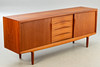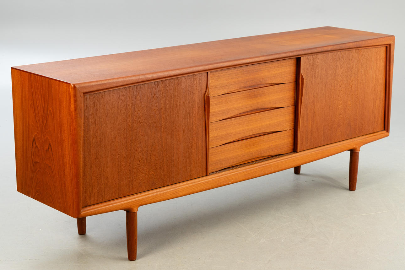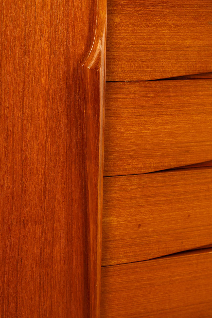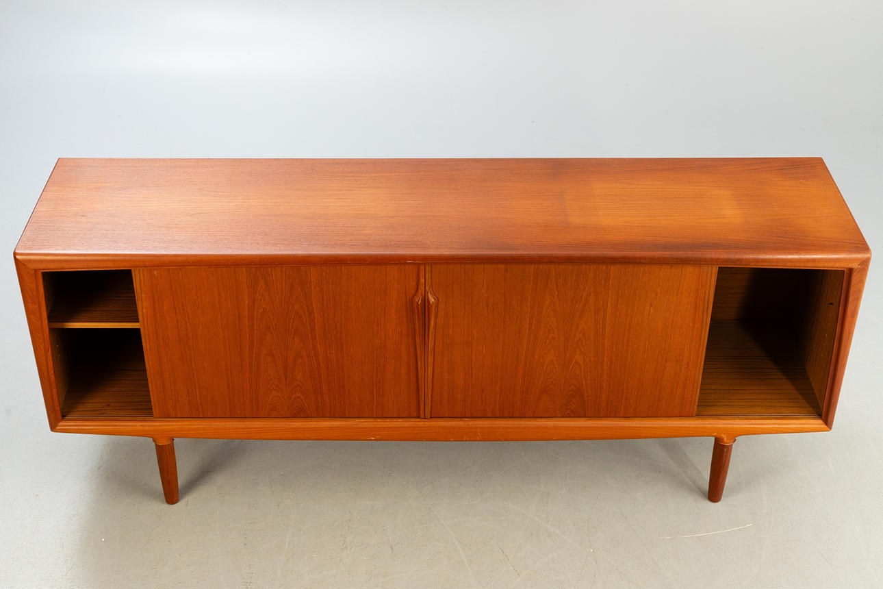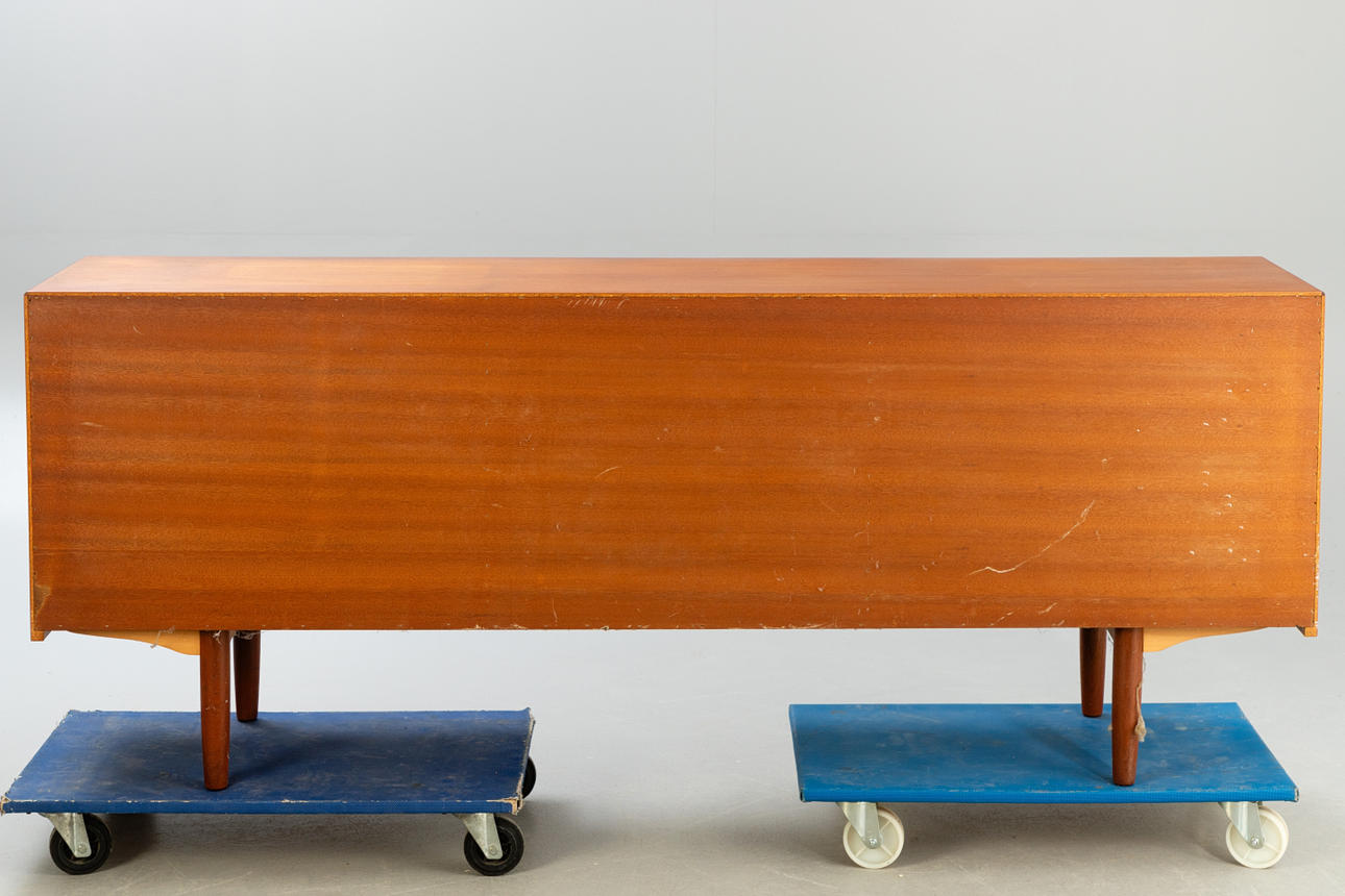 Denmark, 1960s. Teak wood, with two sliding doors and five central drawers, each equipped with a shelf.