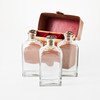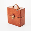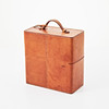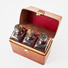 3 bottles with coin stoppers, leather case, height 24, 23x11.5 cm.