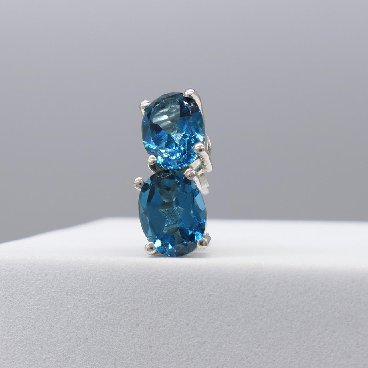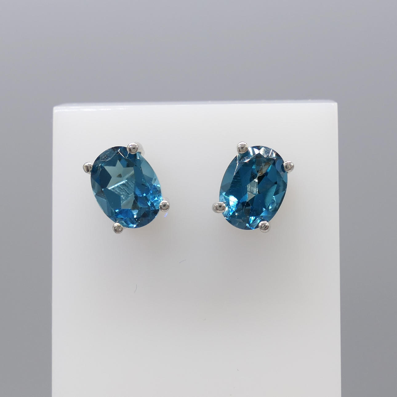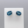 Each stud in this pair is claw-set with an oval-cut natural London blue topaz measuring 8 x 6mm.