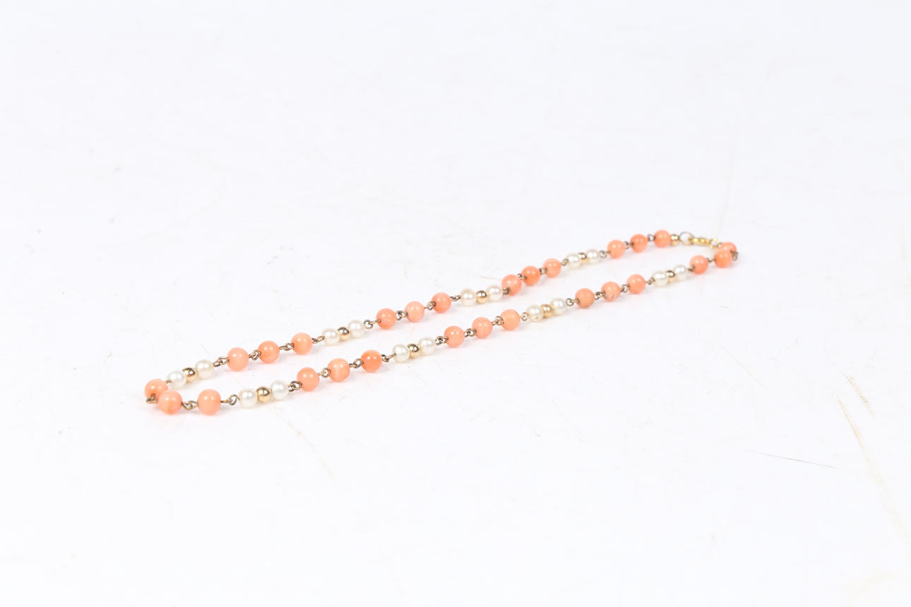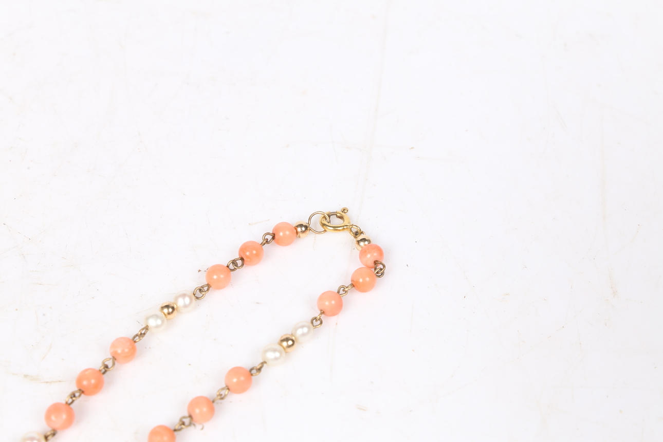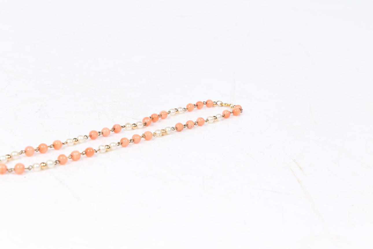 Set with alternating simulated pearls, imitation coral and yellow metal beads. Length 16.5". Hallmarked 'SPB, 375, London, 1997'. Weight 12g.