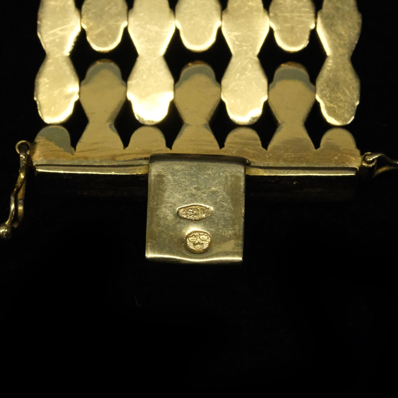18k gold, most likely italian. Stamped “FOMP 462V 750" and with Swedish control mark. Length 18,5cms, width 2,8cms. Weight approx. 47,7grams.