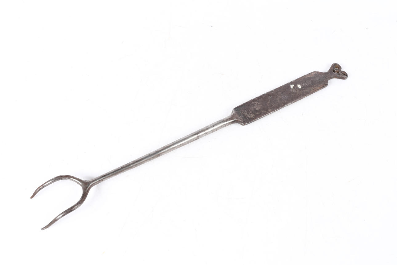 A GEORGE III IRON MEAT FORK, DATED 1775.