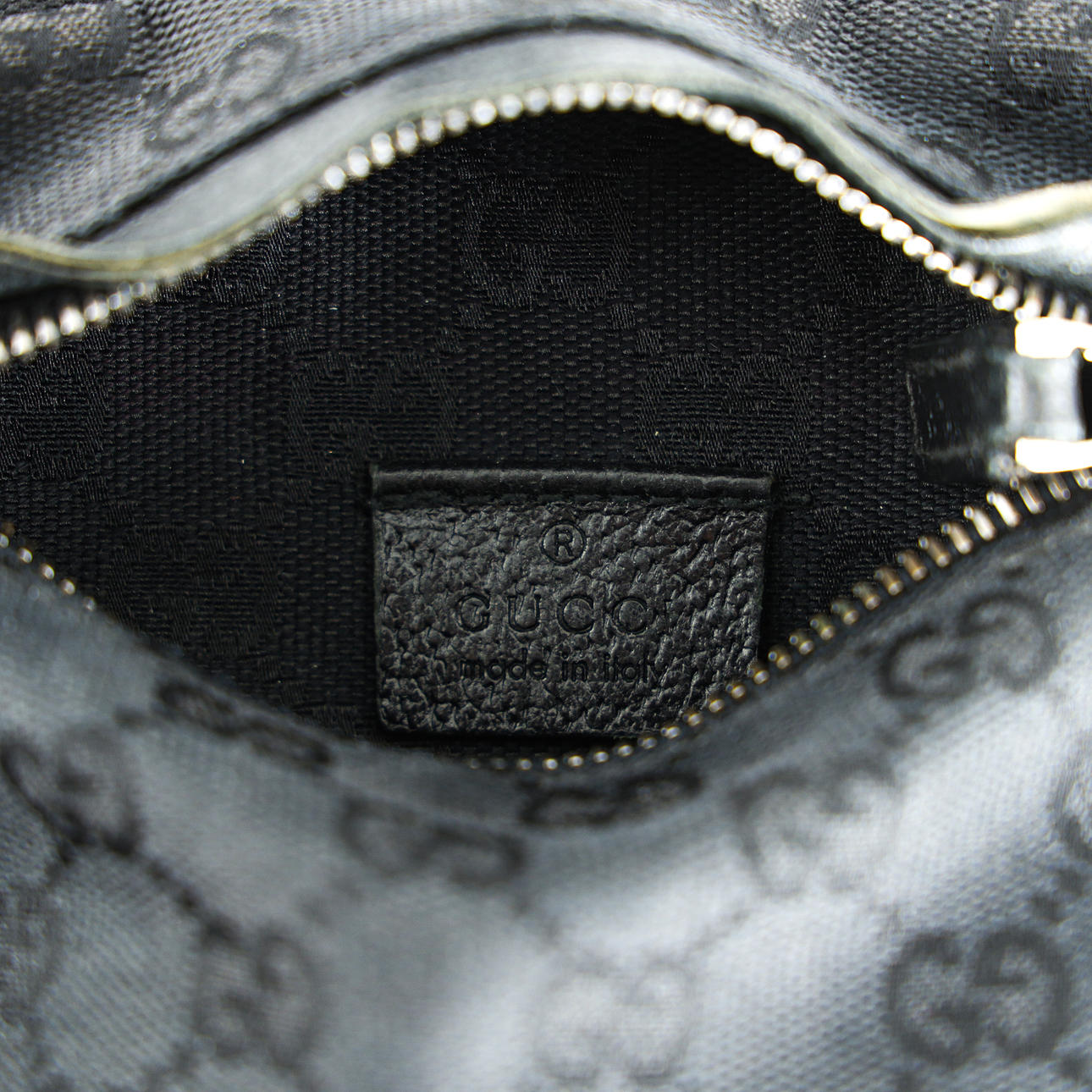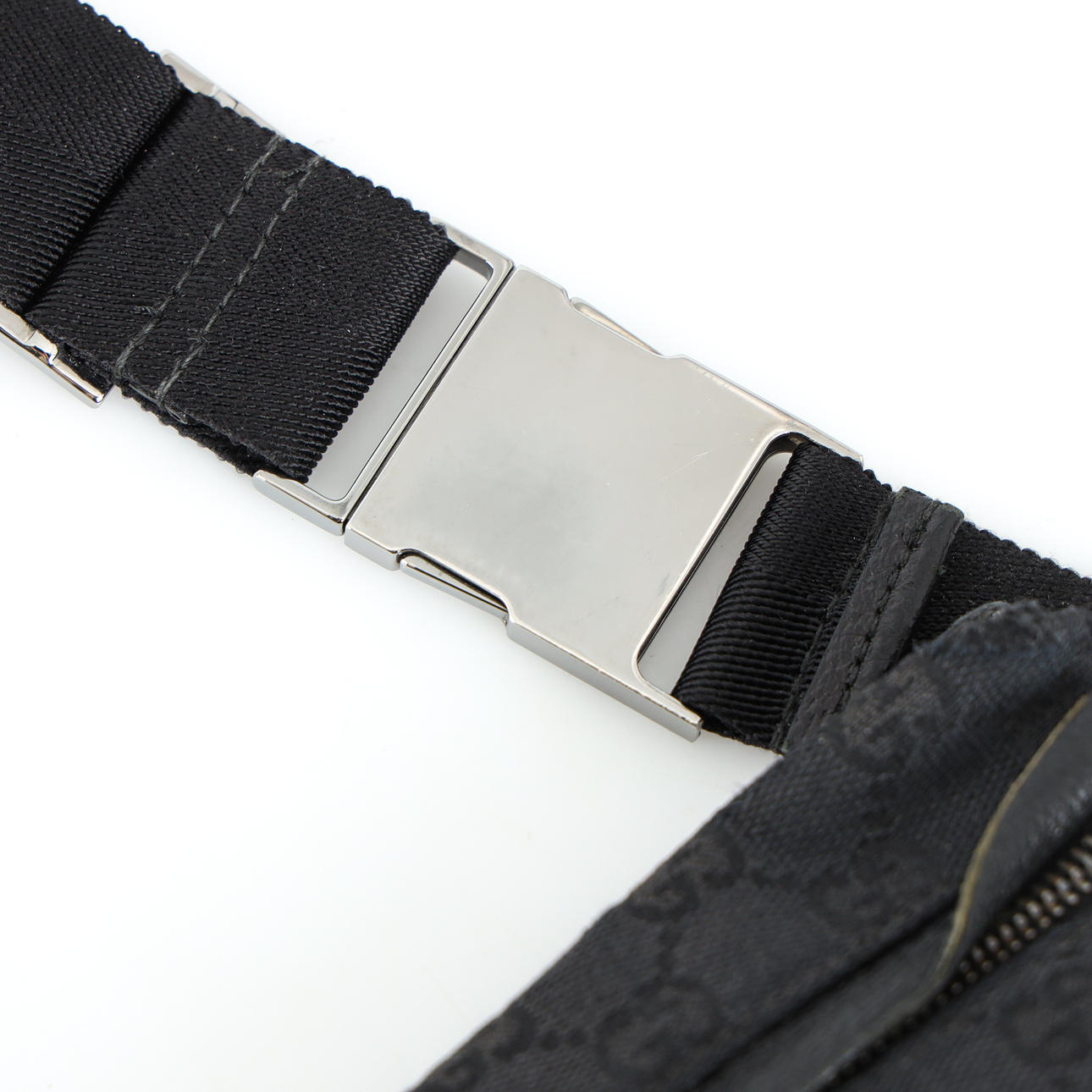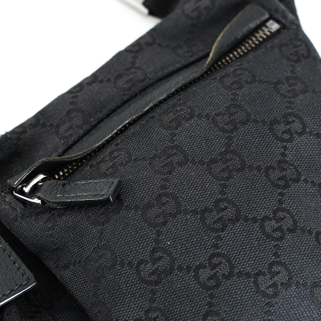 in black cotton canvas with details in black pig leather. Marked GUCCI, made in Italy 28566 492783. Adjustable waist strap, max approx. 113 cm. Dustbag included. Approx. 30x16x2.5 cm.