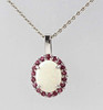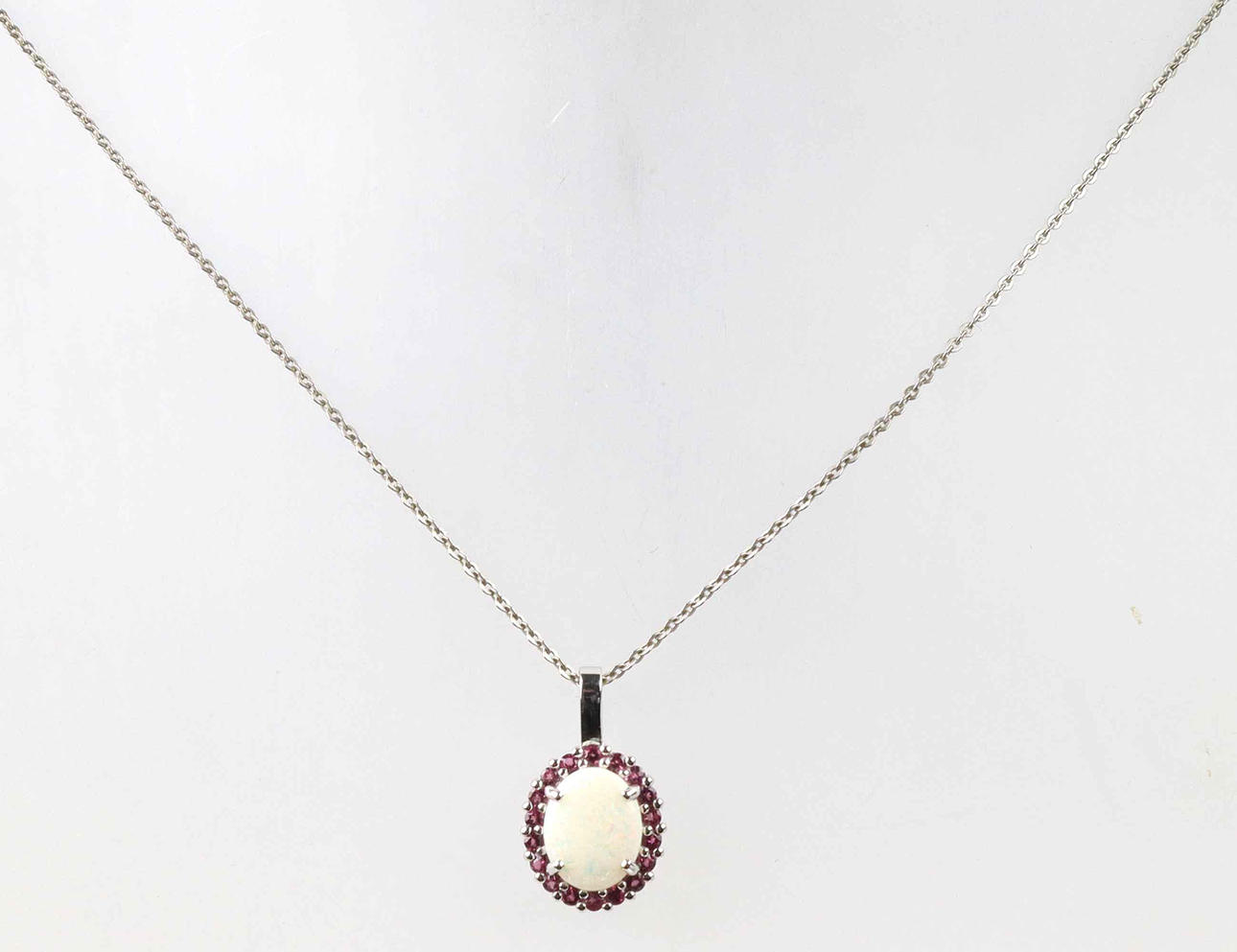 Pendant hallmarked 375 white gold (9 carat) and *JLO* logo, ca. 1.95 grams, approx. 14 x 12 mm, with an oval milk opal cabochon of approx. 10 x 8 mm in finely iridescent colors set with a polished surface, entourage of 18 round faceted rubies, length with fixed eyelet approx. 20 mm with fine anchor chain hallmarked 333 white gold (8 carat), approx. 1.3 grams, length with spring ring clasp approx. 41 cm, total 2 parts of ca. 3.25 grams.